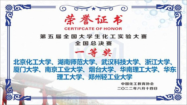 武科大网讯(通讯员岳哲) 8月14日,第五届全国大学生化工实验大赛全国总决赛在四川大学落幕,我校化学与化工学院本科生成振华、高明杰和魏雄同学组成的“MIB”队荣获全国总决赛一等奖。这是我校首次入围该项赛事的全国决赛,并取得了全国一等奖第三名的好成绩。