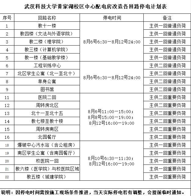 我校黄家湖校区中心配电房配电柜设备已投入使用近20年,已超设备使用年限。自去年以来故障频发,严重影响学校正常的教学和科研秩序,同时也给广大师生生活带来诸多不便。为确保供电安全,学校拟于暑期对黄家湖中心配电房进行设备更换升级,现根据校园用电实际情况,将近期各区域停电时间通知如下:
