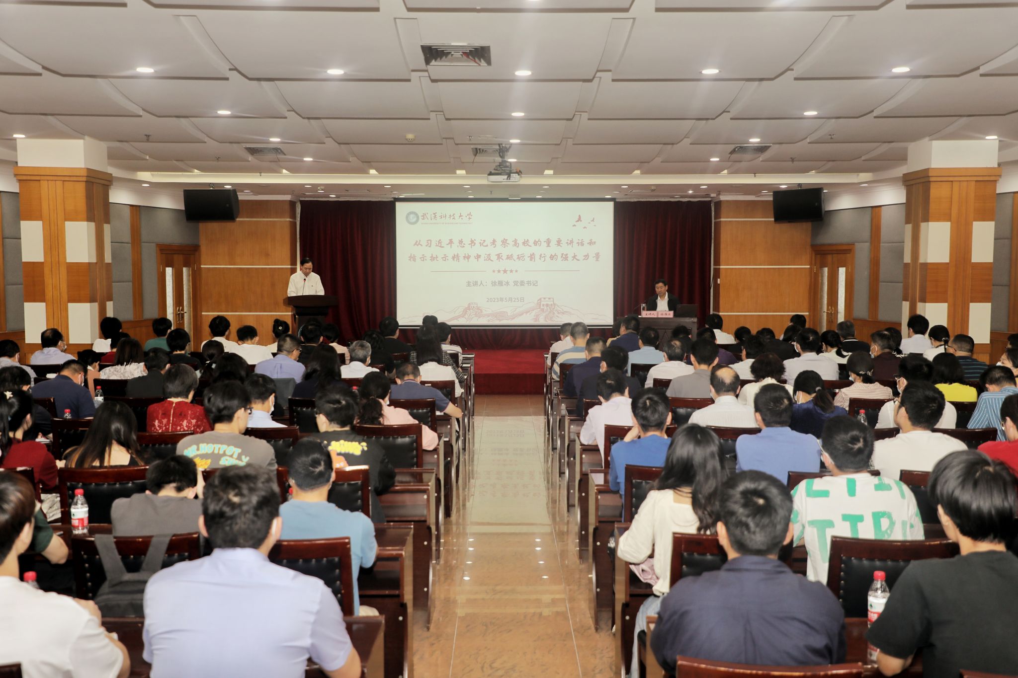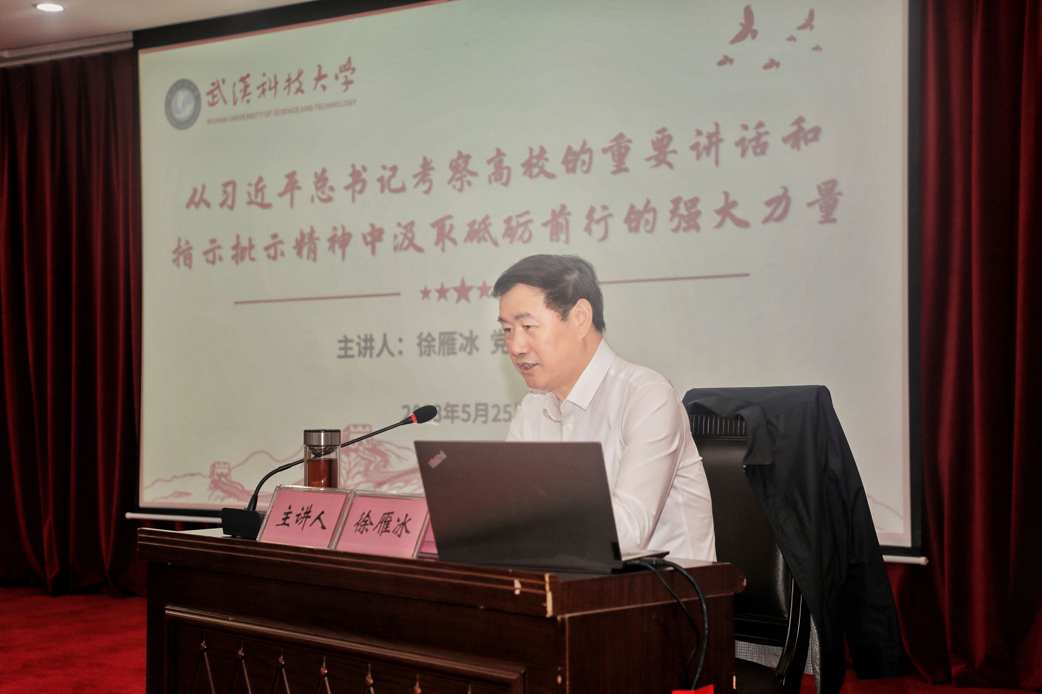 武科大网讯 5月25日下午,校党委书记徐雁冰在青山校区主楼18楼报告厅以《从习近平总书记考察高校的重要讲话和指示批示精神中汲取砥砺前行的强大力量》为题,讲授主题教育专题党课。省委第十五巡回指导组组长吕文艳、成员张旻莅会指导,全体校领导,机关职能部门、直(附)属单位中层正职,二级党组织书记、副书记,学生党员代表参会。校党委副书记孙国胜主持。