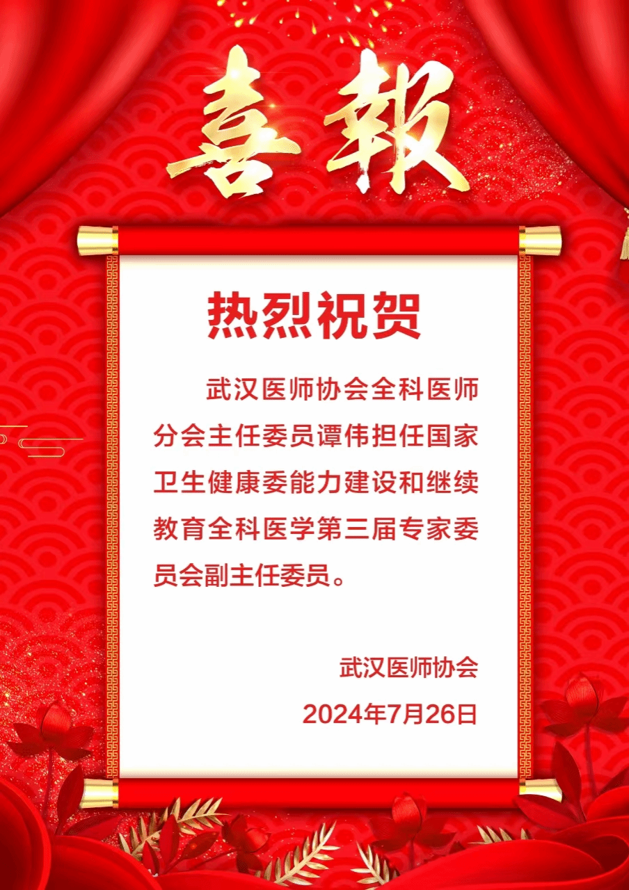 武科大网讯 7月25-26日,国家卫生健康委能力建设和继续教育全科医学专家委员会第三届换届会议举行。我校附属老年病医院全科医学学科带头人谭伟教授当选国家卫生健康委能力建设和继续教育全科医学第三届专委会副主任委员。