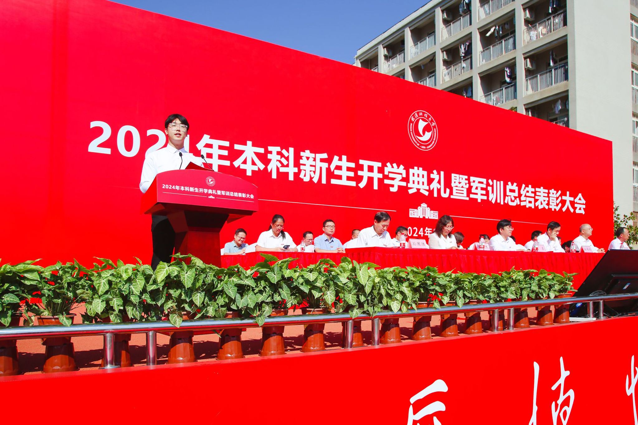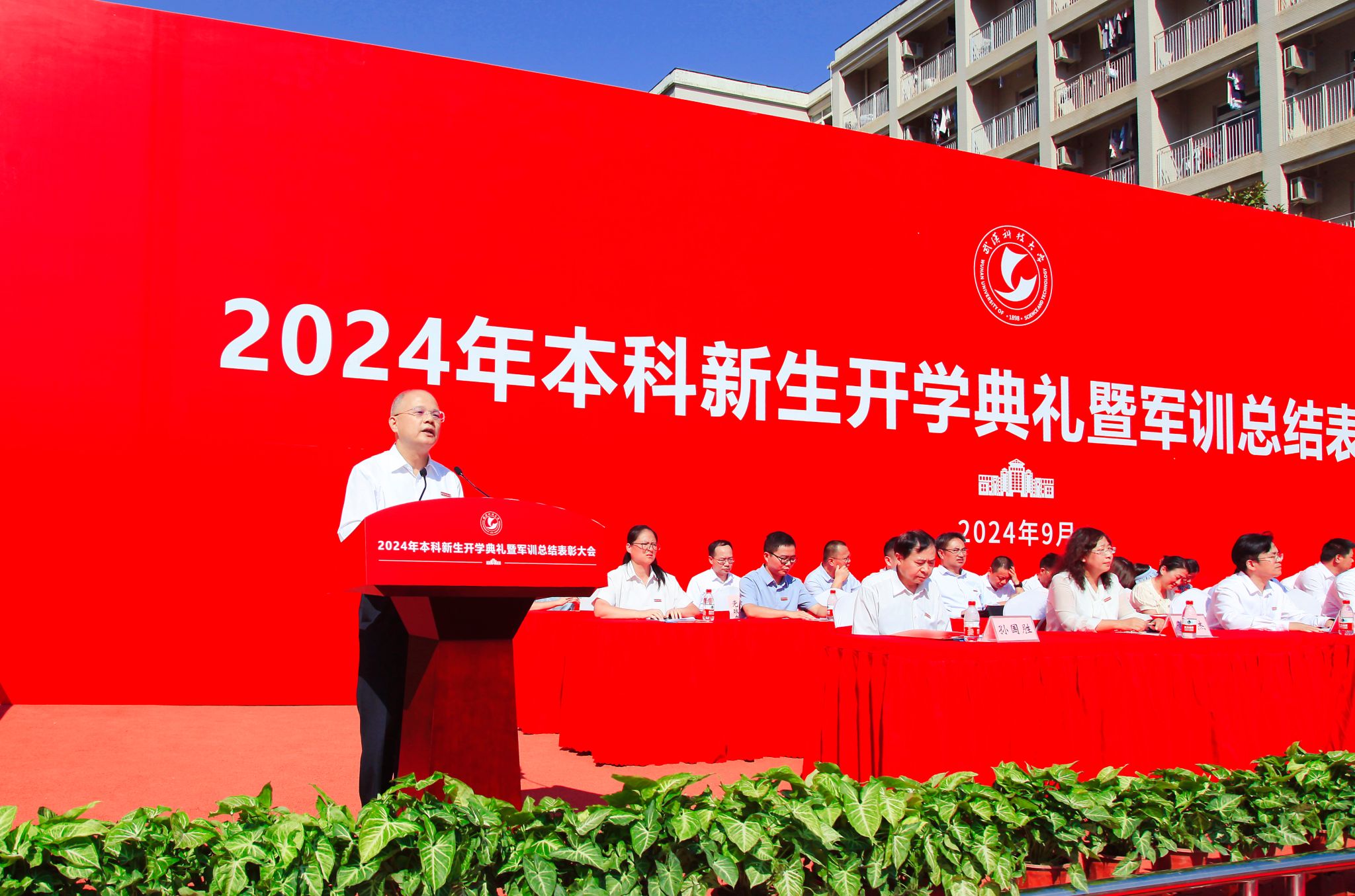 武科大网讯(通讯员刘喆 程秦晴)9月29日上午,2024年本科新生开学典礼暨军训总结表彰大会在我校黄家湖校区南园操场隆重举行。校党委书记徐雁冰,校长倪红卫,党委副书记孙国胜,副校长吕勇、马腾、董丽杰,党委常委刘时新,空军预警学院大队长张力以及学校各职能部门、各学院领导出席本次大会。孙国胜主持大会。