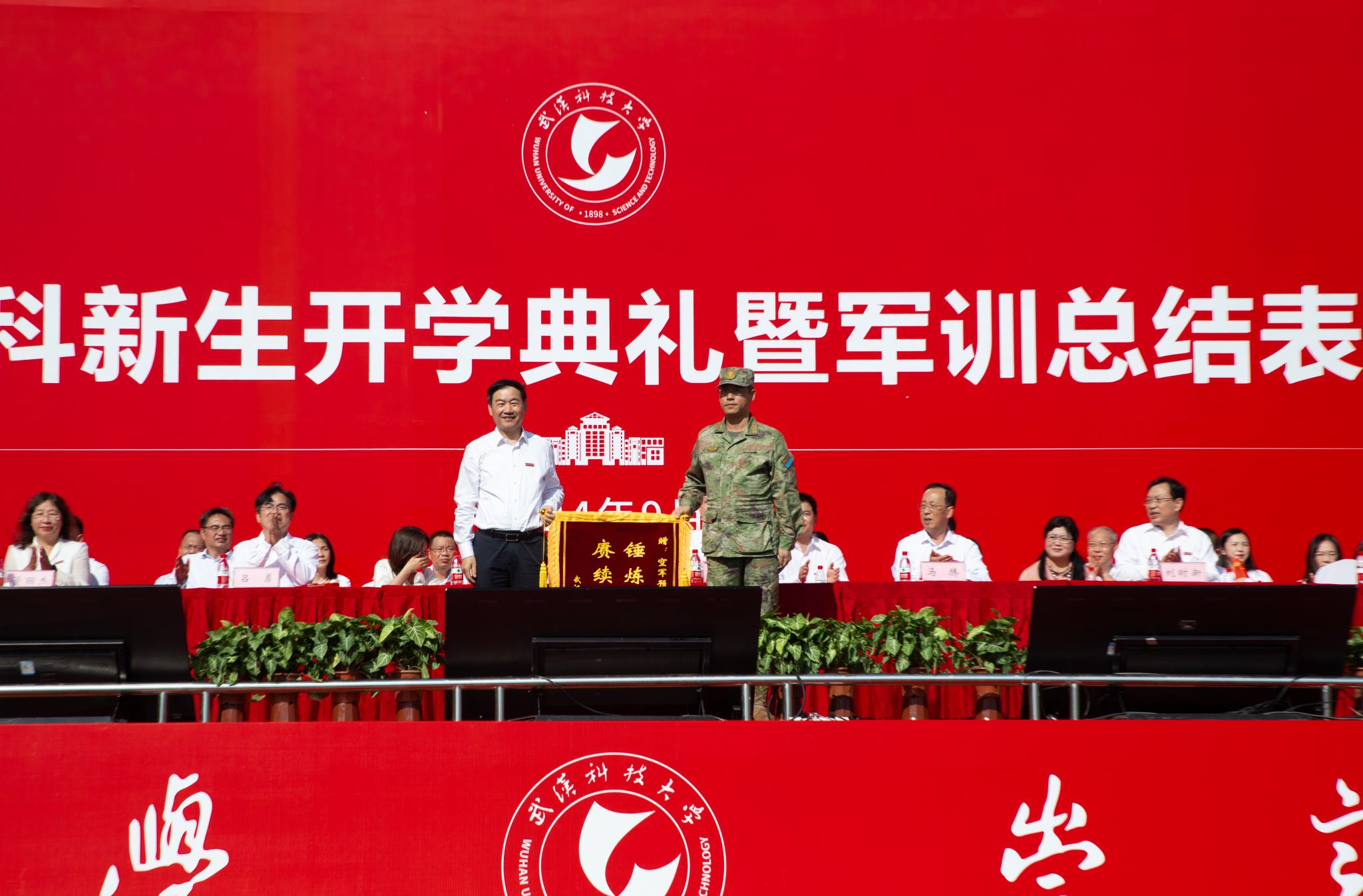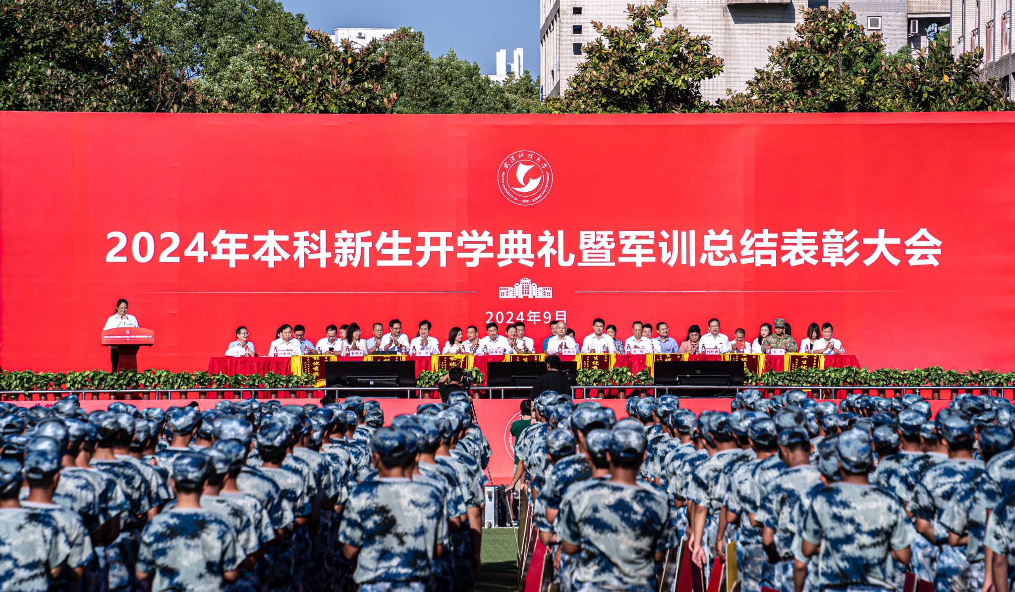 6200 余名本科新生身着迷彩服参加此次活动。大会在庄严雄壮的国歌旋律中拉开序幕。摆字方阵迅速调换红、黄纸板,依次摆出 “WUST”“1949”“中国” 等字样,擒敌拳方阵的拳术动作整齐划一,应急棍方阵接踵而至,匕首操方阵在响亮的 “杀” 声中精彩完成表演,武术表演和战场战术表演结束后赢得了场上阵阵掌声。各学院新生身着迷彩服,高举旗帜,喊着嘹亮的口号,迈着整齐的步伐从主席台前走过。