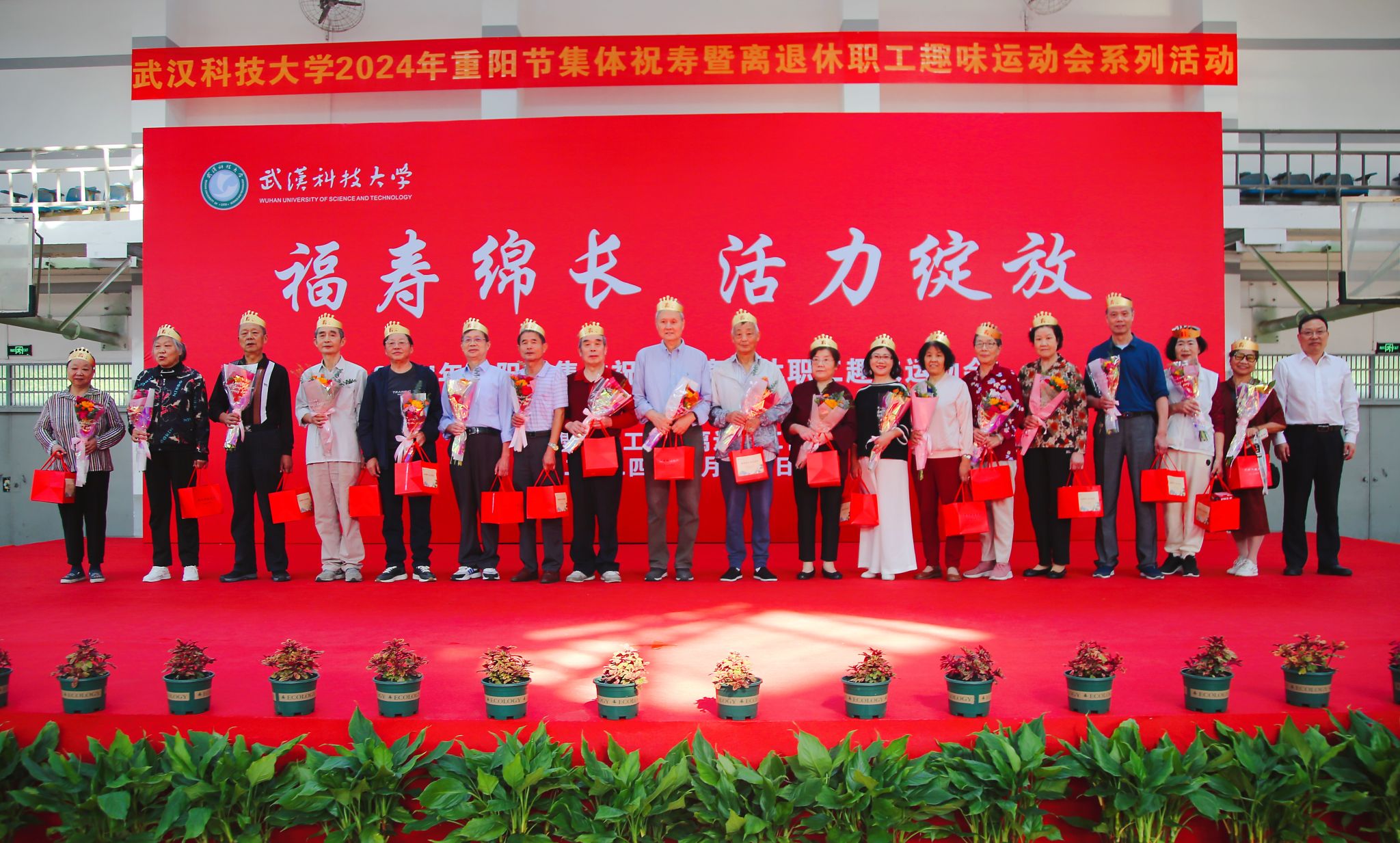 武科大网讯(记者李芳) 10月11日上午,又逢一年一度的重阳佳节。2024年“福寿绵长 活力绽放”集体祝寿暨离退休职工趣味运动会在我校青山校区东院体育馆举行。校党委书记徐雁冰,党委常委、副校长沈季伟,党委常委、组织部部长刘时新同现场90、80、70周岁寿星,老党员、老教师等代表,以及有关职能部门负责人欢聚一堂,共庆佳节。