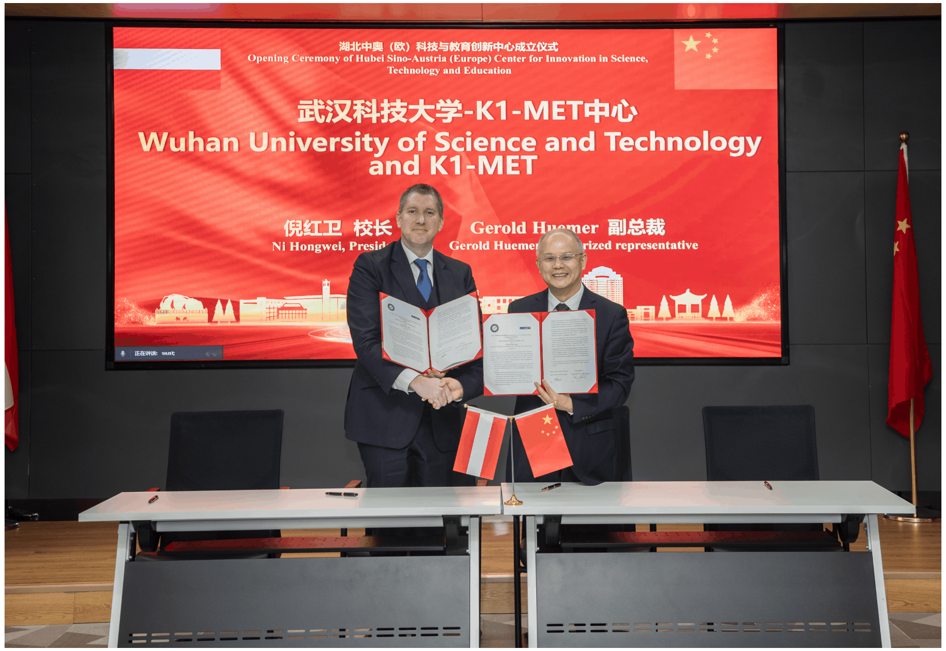 徐雁冰、Peter Moster共同为“湖北中奥(欧)科技与教育创新中心”揭牌。倪红卫代表学校与莱奥本矿业大学、K1-MET中心分别签署了合作协议。