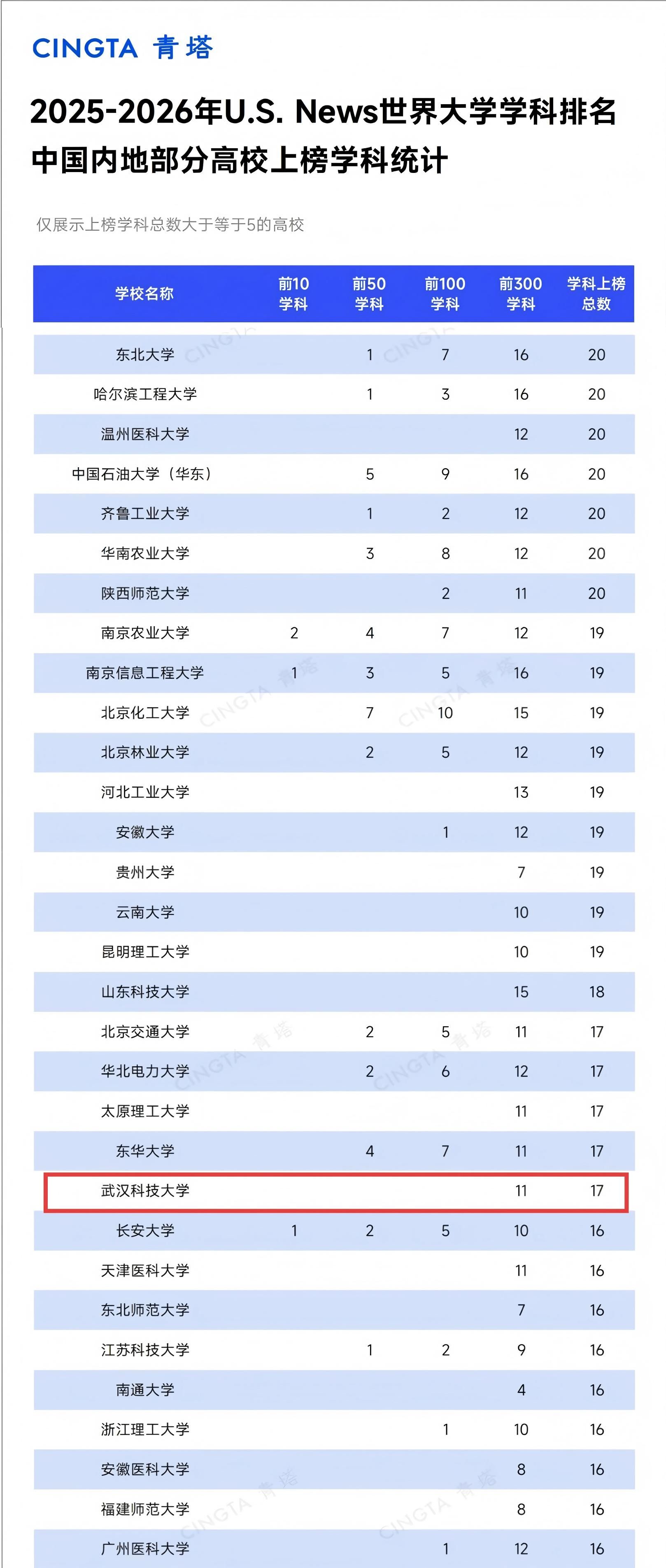 同时,U.S. News公布了2025-2026年度世界大学学科排名,共划分了51个细分学科。我校共有17个学科上榜,其中11个学科进入全球学科排名前300。