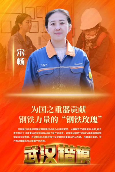 宋畅现为宝钢股份中央研究院武钢有限技术中心的主任研究员,高级工程师。从事钢铁产品研发10余年,她负责并参与了11项重点研究项目及40余个新产品开发,她领衔研发的750MPa级高强度高精度磁轭钢实现全球首发,应用于乌东德、白鹤滩水电站发电机转子,份额超80%,单机容量突破百万千瓦,超越三峡而雄踞世界水电之巅,有利推进我国水电工程国产化进程。