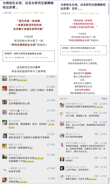 武科大网讯(记者叶显伟)近日,我校信息学院2020级研究生吴宇在青山江滩不顾个人安危,勇救轻生女孩的事迹引发媒体广泛关注,人民日报、新华网、光明网、中国青年报、中国网等媒体纷纷报道,在社会引起良好反响,网友纷纷点赞。