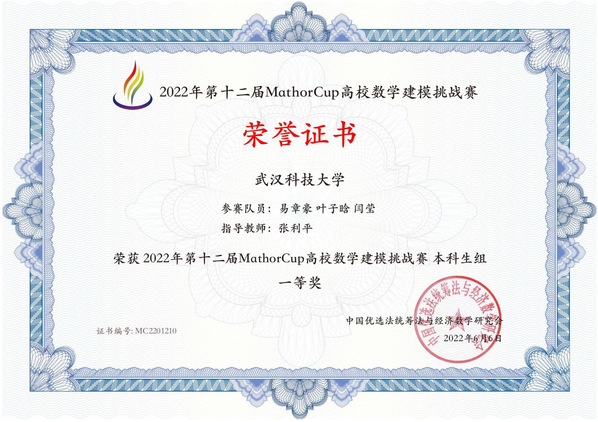 武科大网讯(通讯员叶子晗)近日,2022年第十二届MathorCup高校数学建模挑战赛获奖名单于官网公示,我校本科生组获得一等奖5项、二等奖18项、三等奖32项,研究生组获得二等奖6项、三等奖14项。其中,由机械自动化学院张利平教授指导的本科生组一等奖队伍荣获Apollo高校数学建模创新奖,且排名第一,实现了我校在“Apollo高校数学建模创新奖”类别的零突破。