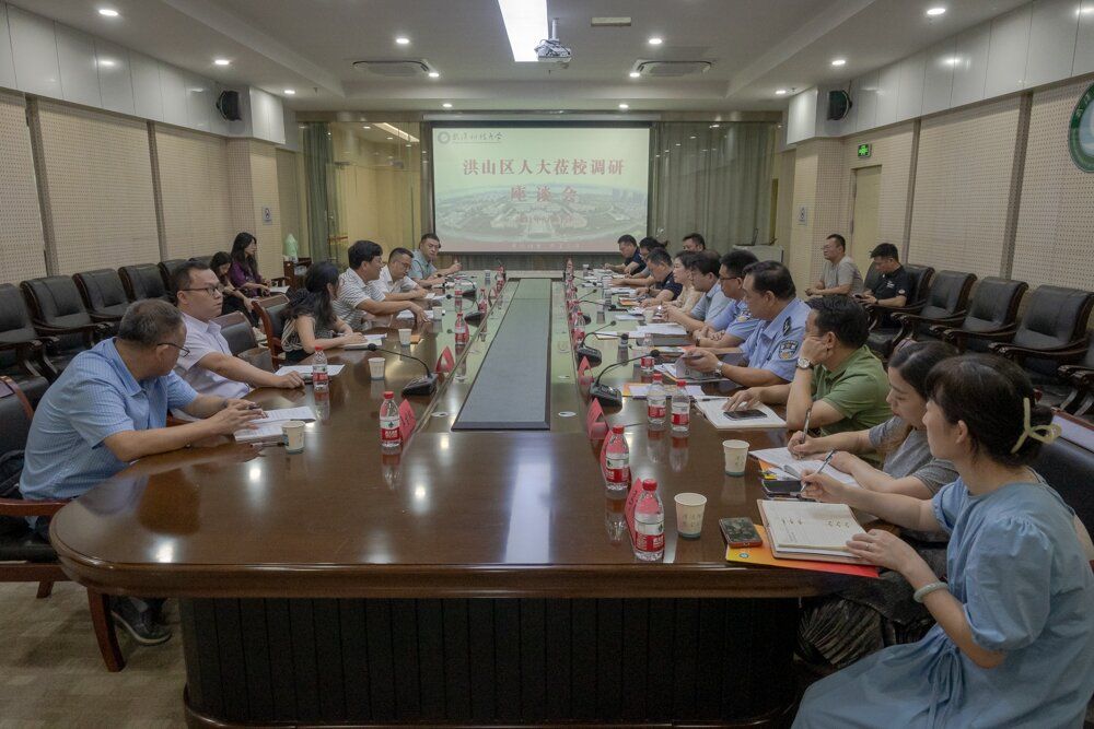 武科大网讯(通讯员江欢 摄影李钰昌)8月31日,洪山区人大常委会副主任何线一行来到我校黄家湖校区进行调研座谈。副校长沈季伟主持会议。