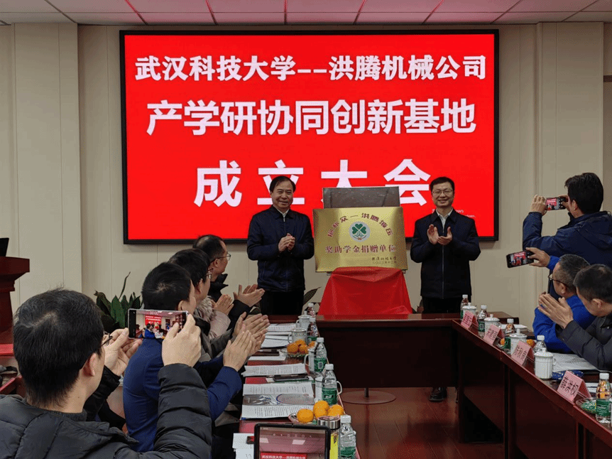 武科大网讯(通讯员张坡)12月19日上午,机械自动化学院与江阴市洪腾机械有限公司共同举办的产学研合作和奖助学金捐赠仪式在洪腾机械有限公司会议室举行。校党委副书记孙国胜、公司所在地党委行政负责同志、洪腾机械有限公司董事长薛洪权、机械自动化学院党委书记余淑均、校友工作与社会合作处副处长刘昱佳、机械自动化学院党委副书记瞿孝平以及信息科学与工程学院、机械自动化学院教师代表参加了此次仪式。仪式由薛洪权主持。