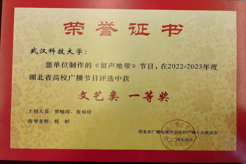 2024年全省高校广播工作会议由湖北省广播电视学会高校委员会召开,湖北省高校广播协会全体会员单位参与会议。会议通报了2022-2023年度湖北省高校广播节目评选结果,并颁发2023年度先进集体及个人奖状。其中,我校融媒体中心制作的节目《留声地带》荣获2022-2023年度”文艺类一等奖“,我校融媒体中心被授予2023年度“湖北省高校广播工作先进集体”。