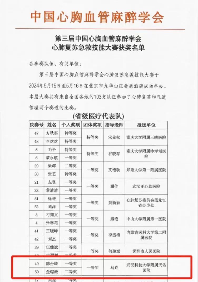武科大网讯(通讯员谢靖)5月16日,“心手相连·点亮生命”第三届中国心胸血管麻醉学会心肺复苏急救技能大赛总决赛在北京成功举办。我院麻醉科团队作为省级医疗代表队参赛,陈丹琦医生获得个人一等奖,金璐薇医生获得个人二等奖,麻醉科团队获得团体一等奖。