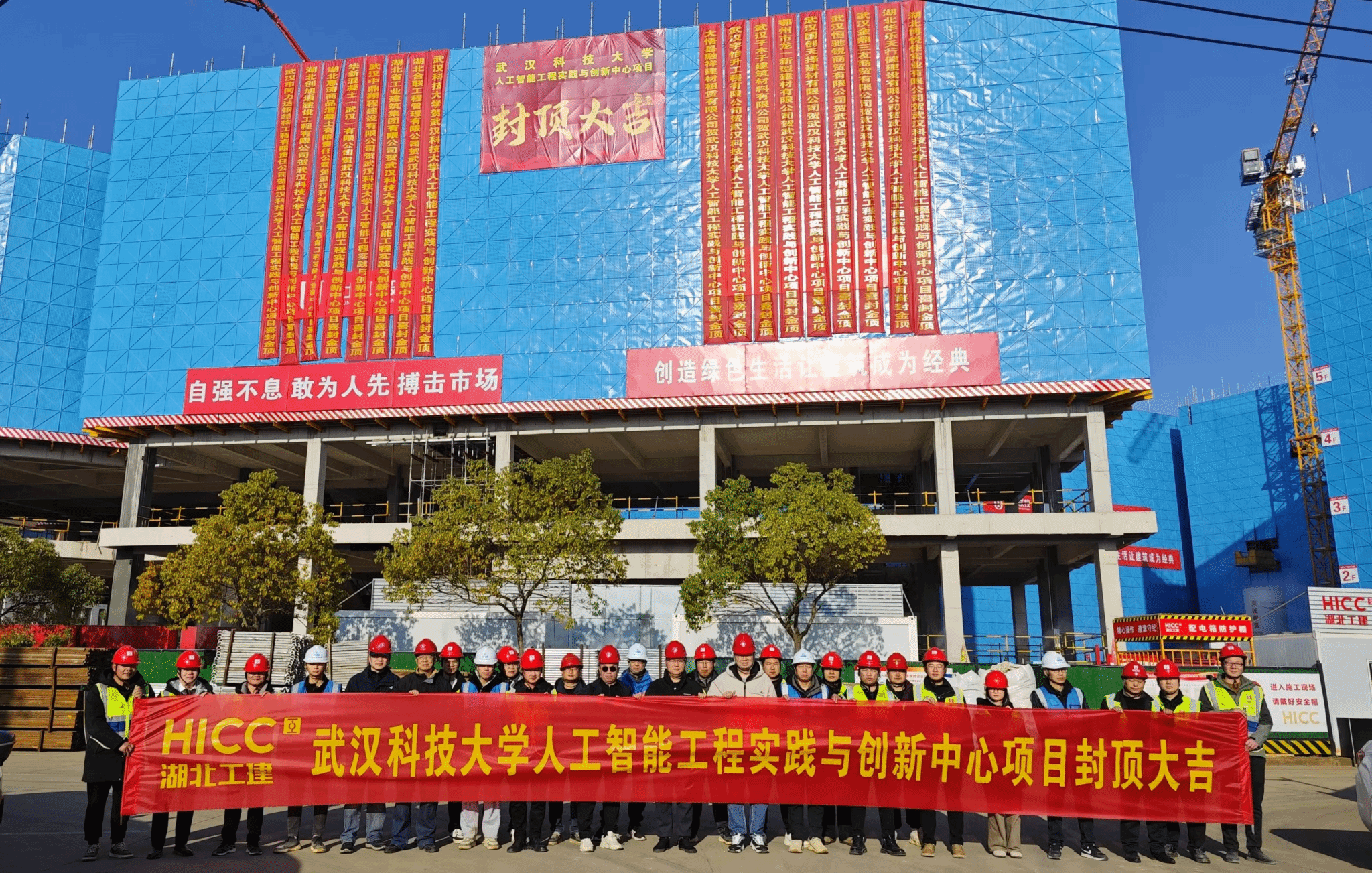该项目被列入国家发改委、教育部“十四五”教育强国计划,作为“教育强国推进工程”之一。自2023年启动以来,得到各级主管部门的大力支持。学校领导高度重视、统筹安排、强化管理,校党委书记徐雁冰、校长倪红卫、党委副书记沈季伟、副校长陈志刚多次亲临项目现场,检查指导工程建设及安全生产工作。项目于2024年6月正式开工建设,校园建设处联合各参建单位精诚合作、挂图作战、日夜奋战、合理组织工序穿插,充分发扬敢为天下先的精神,正式开工仅用不到6个月时间就完成了“不可能完成的任务”,展现出了“武科大速度”,提前实现了项目的顺利封顶。下一步,项目将进入二次结构、幕墙施工、装饰装修及设备安装阶段,按照施工进度,全部工程预计2025年底前全面竣工并交付使用。