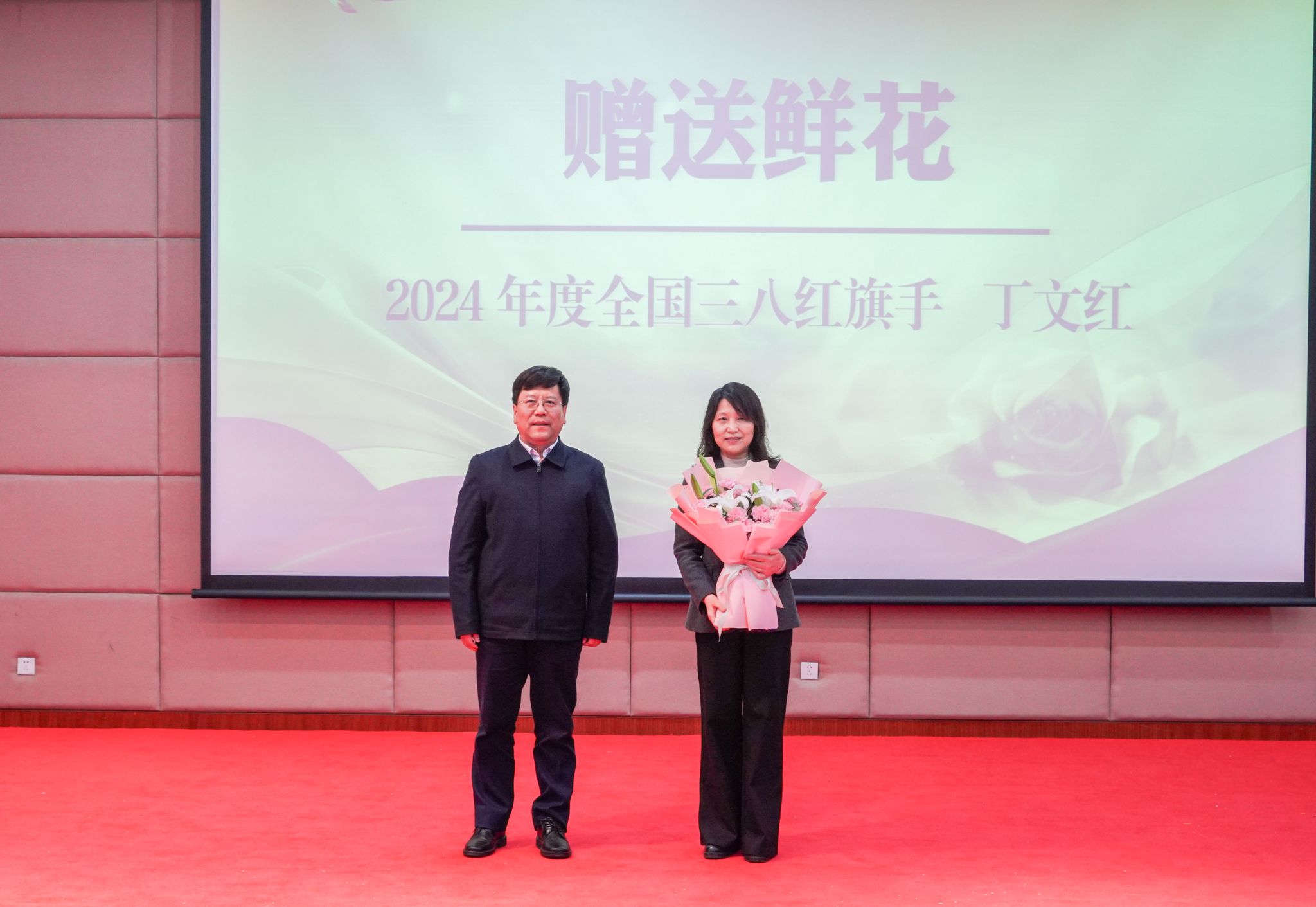 会上,沈季伟代表学校向刚刚获得2024年度“全国三八红旗手”荣誉称号的材料学部丁文红教授赠送鲜花表示祝贺。