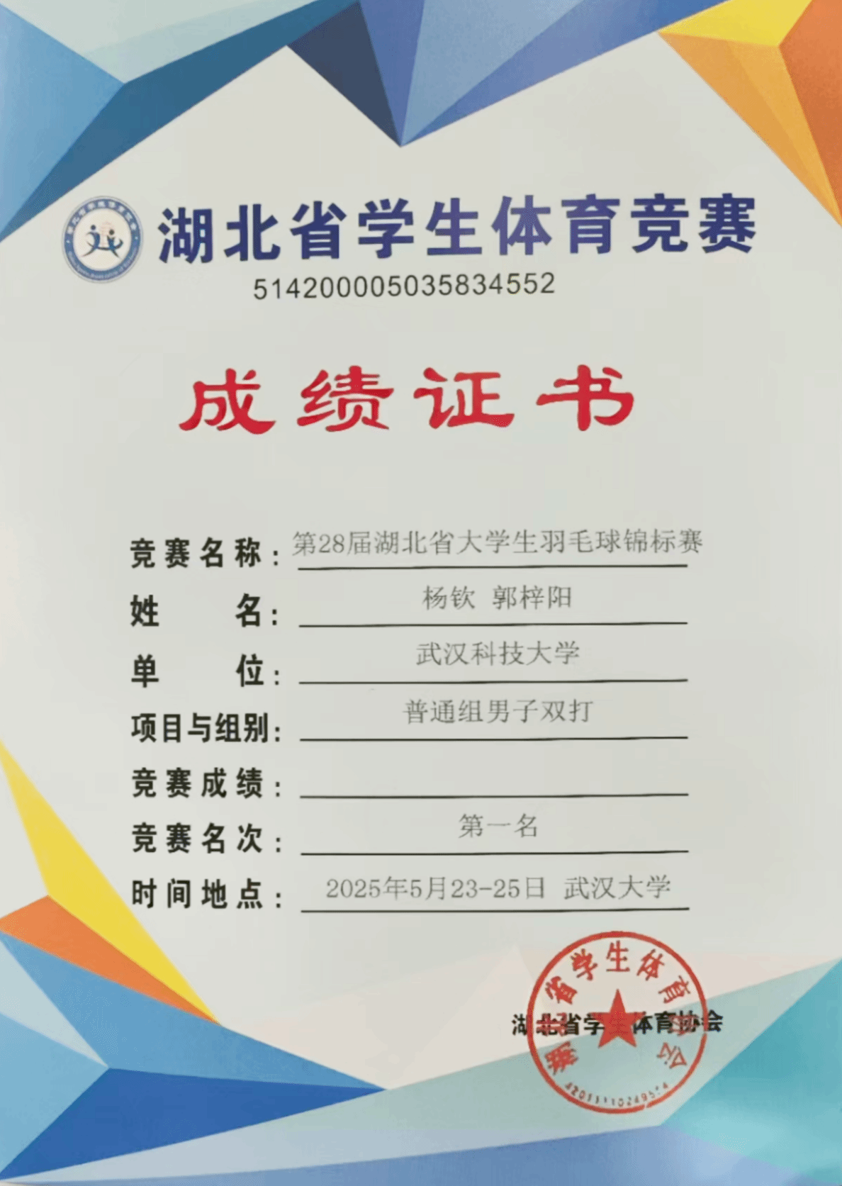 武科大网讯 5月23日至25日,第28届湖北省大学生羽毛球锦标赛在武汉举行。在这场汇聚全省高校羽坛精英的赛事中,我校学子郭梓阳、杨钦凭借精湛球技与顽强斗志,摘得普通学生组男子双打冠军,为学校赢得荣誉。