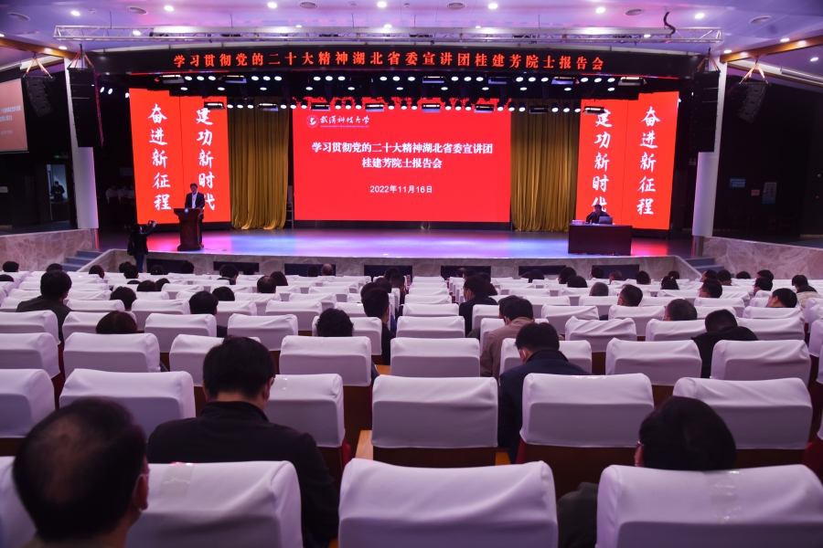 武科大网讯(记者陈孖川)11月16日上午,学习贯彻党的二十大精神湖北省委宣讲团报告会暨处级以上领导干部学习贯彻党的二十大精神培训班开班仪式在青山校区碧园会堂举行。省委宣讲团成员、中国科学院院士、发展中国家科学院院士桂建芳院士作题为《学习党的二十大精神,自信自强、守正创新,为党育人、为国育才,做科教兴国的主力军》的宣讲报告。校党委书记徐雁冰主持会议。