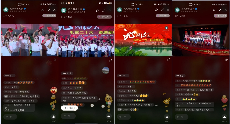 恰逢第二天是我校124周年校庆日。这场两个多小时的诗会,在直播平台上吸引了包括师生、校友、家长在内的近8万人次参与,点赞量超过17万。“祝福母校发展壮大”“祝武科大124岁生日快乐!”“新时代的奋斗者们好样的!”……一条条饱含深情的留言刷屏直播间。