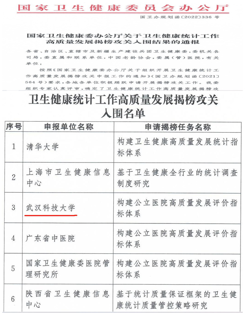 武科大网讯 近期国家卫生健康委员会办公厅公布了“卫生健康统计工作高质量发展揭榜攻关项目”入围名单59项,我校公共卫生学院熊昌娥教授牵头申报的项目“构建公立医院高质量发展评价指标体系”荣登榜单。湖北省属高校仅我校1项入围。