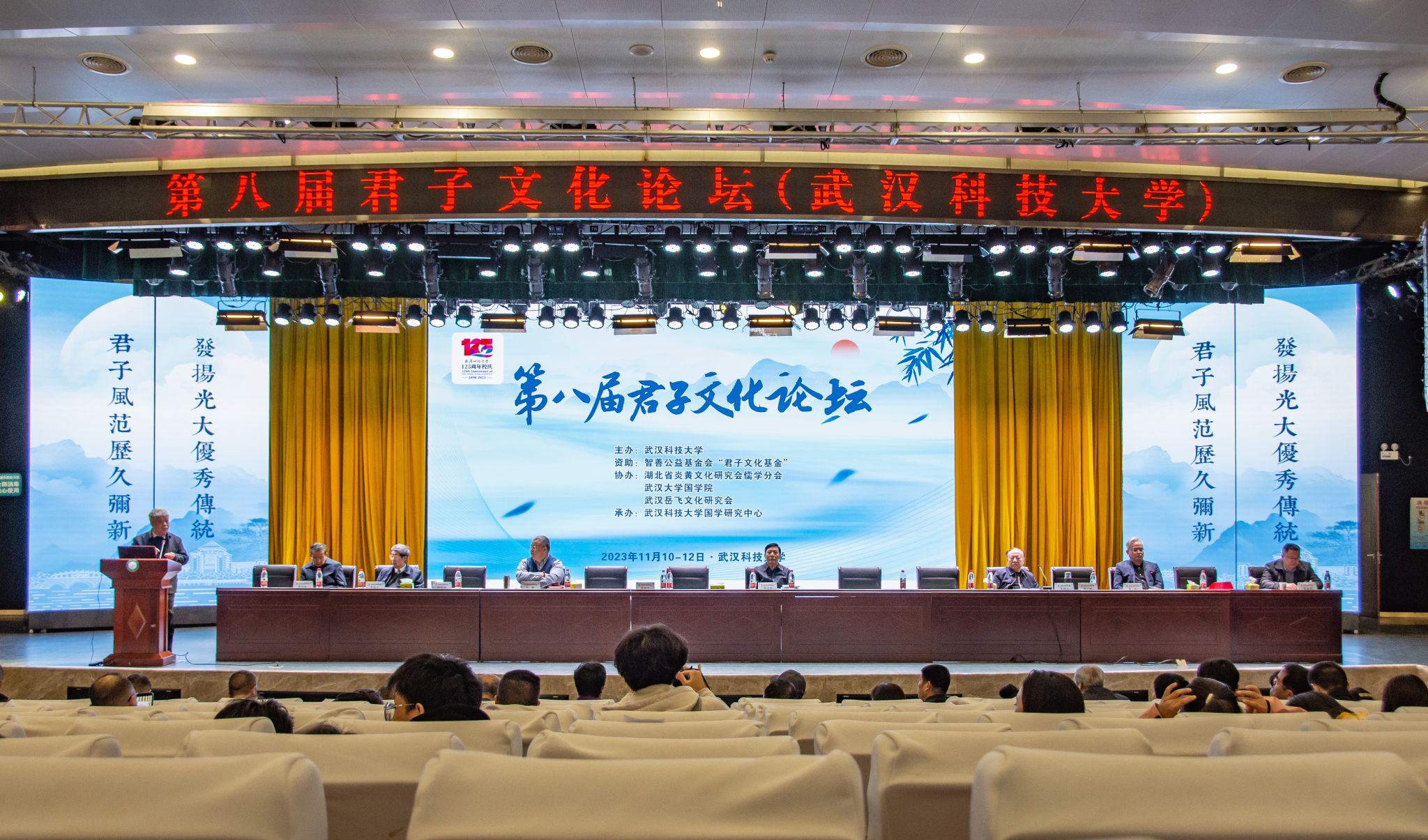 君子风范历久弥新,发扬光大优秀传统。11月11日,第八届君子文化论坛开幕式在我校青山校区钢铁楼碧园会堂召开,本次论坛讨论的主题为“君子文化的知与行”。来自全国高校、科研院所、君子文化研究机构的专家学者和我校师生300余人齐聚一堂,共话君子文化传承与创新。校长倪红卫,光明日报社原副总编辑李春林,著名作家周大新,中央党校教授、中国实学研究会会长王杰出席开幕式并致辞。校党委常委胡剑主持开幕式。