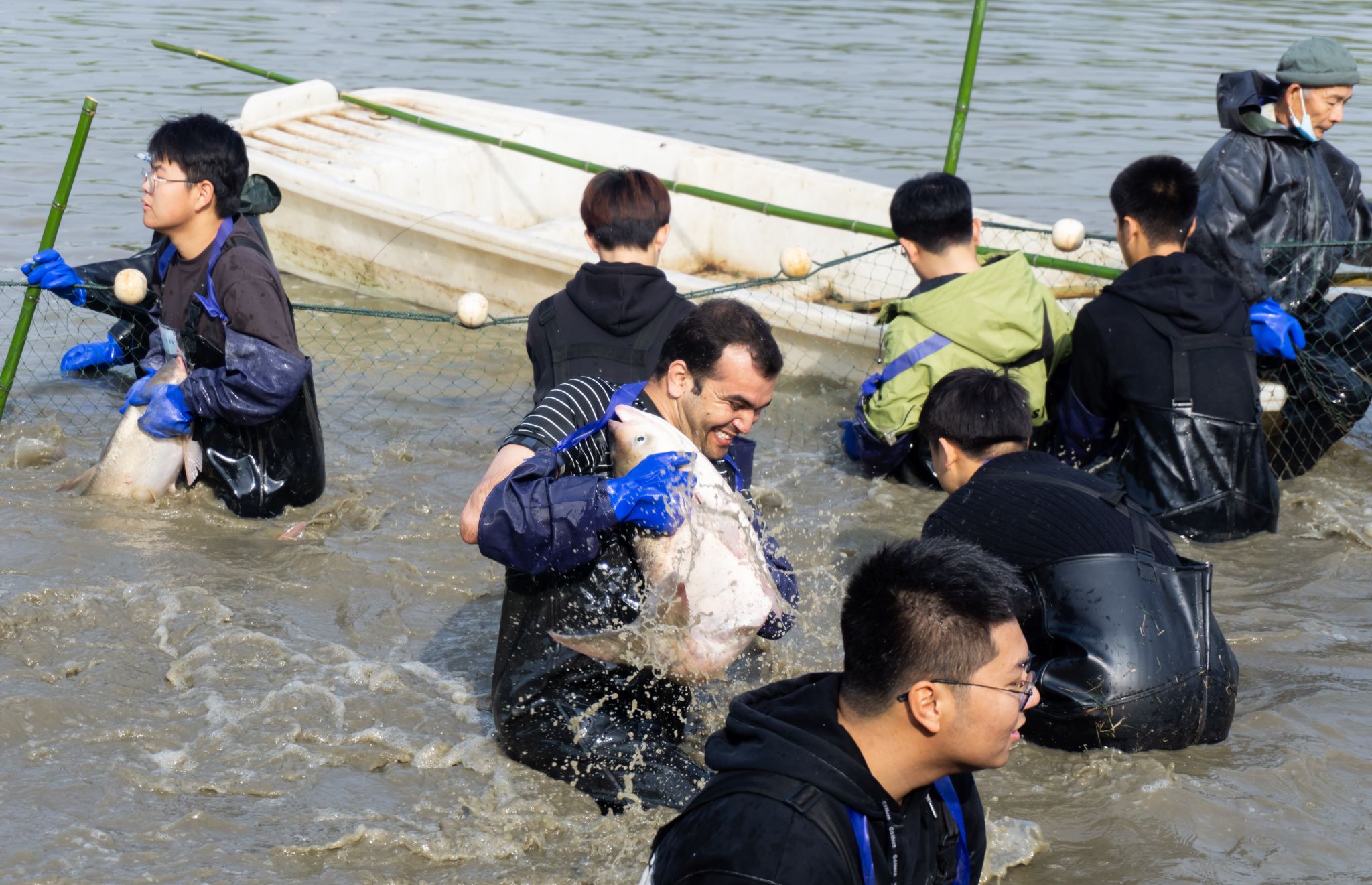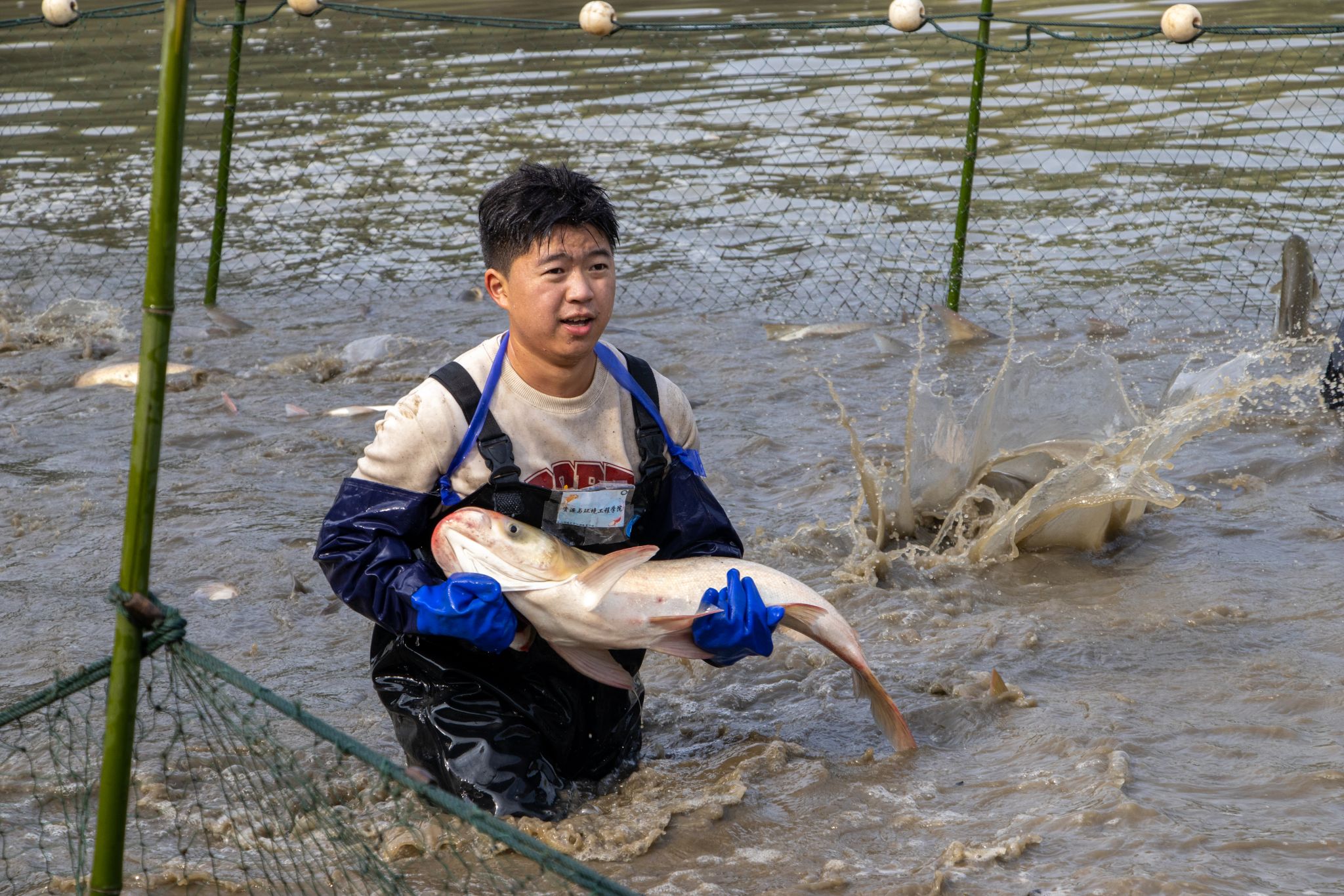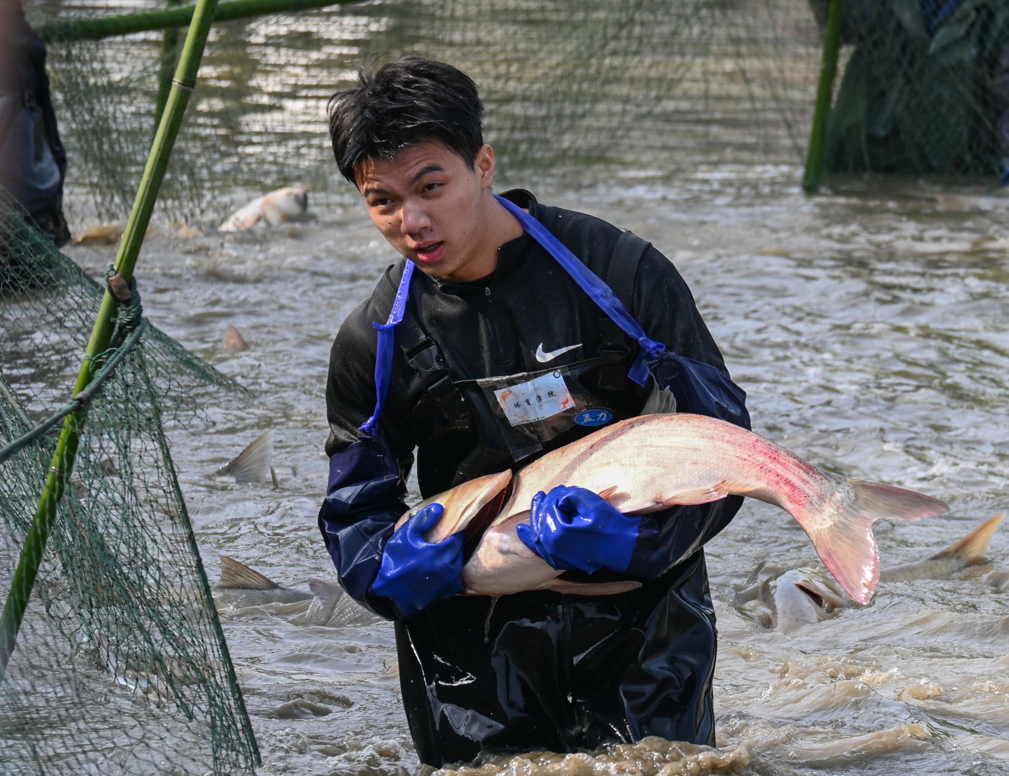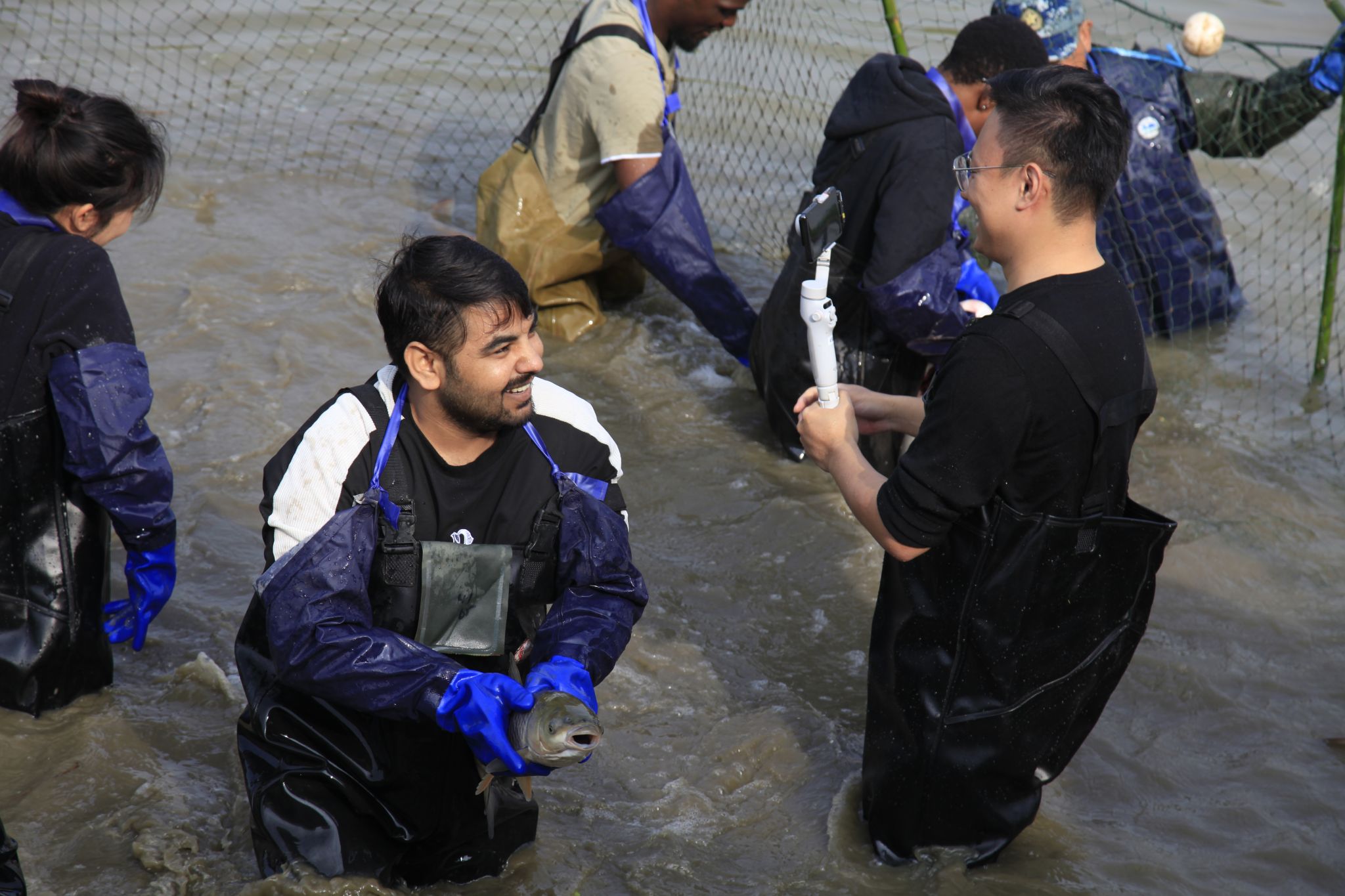 11月21日上午8时,学校近百名中外师生和后勤集团员工身着统一的红色服装,在沁湖边拉开了捕鱼活动的序幕。经过半个多小时的激烈争夺,信息学院徐润收获了一条20.5斤重的大鱼,获得了今年的“捕鱼王”称号。