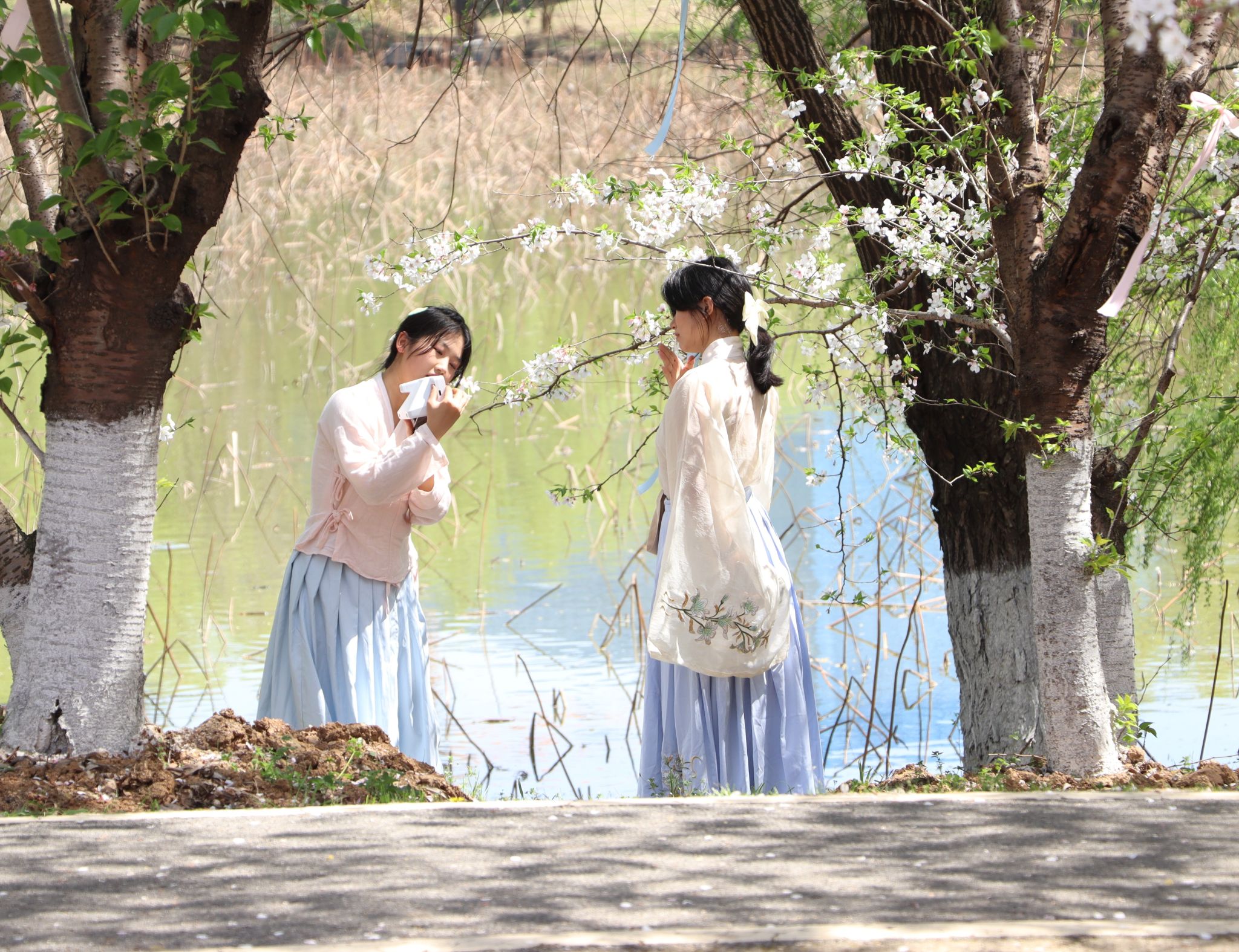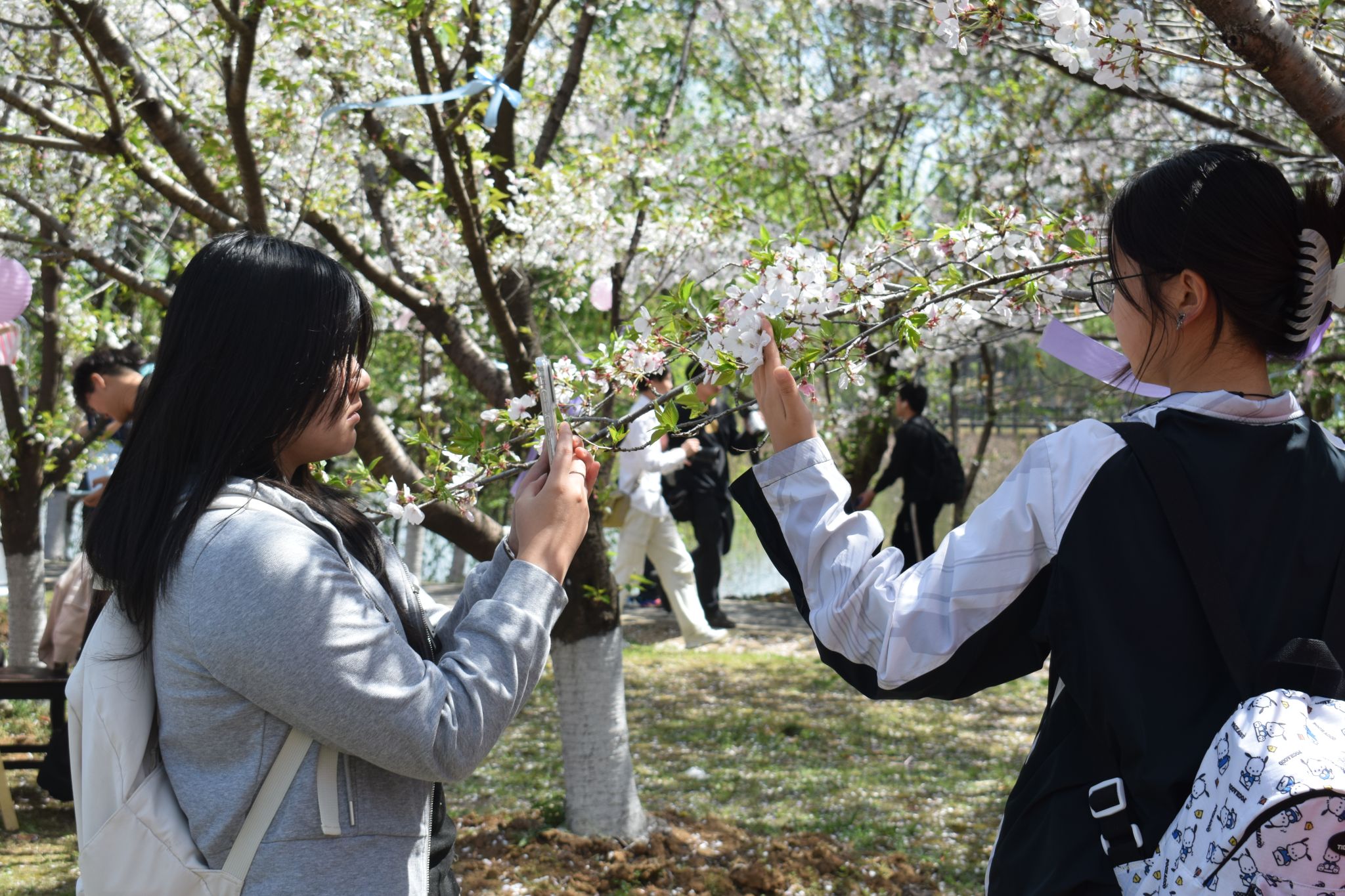 在樱花树下拍照的学生 王铭浩摄