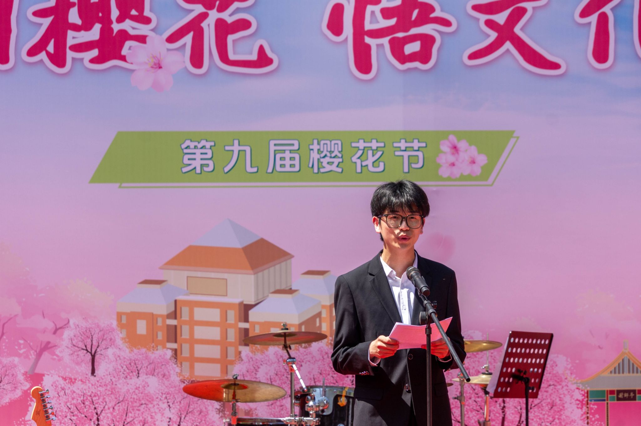 学生代表、社团管理部负责人刘新昊宣读樱花节倡议书 孙正恒摄