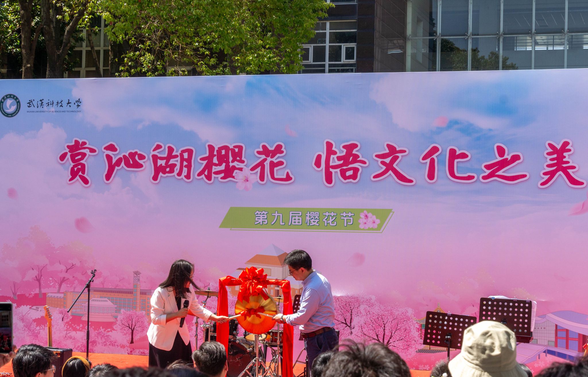 校团委书记王媛媛敲锣宣布樱花节开幕 陈楷林摄