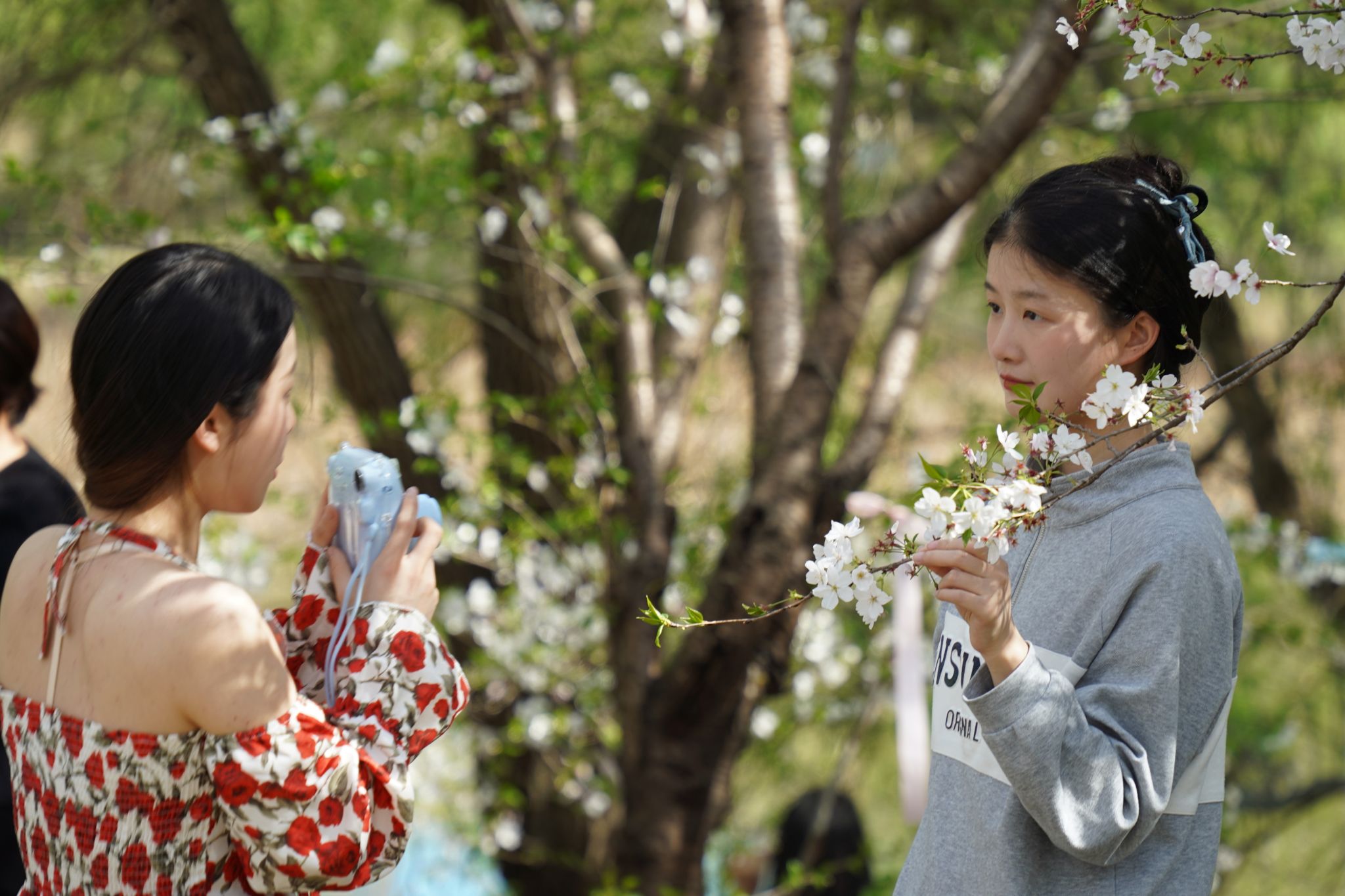 与樱花一起拍照的同学 吴毅萌摄