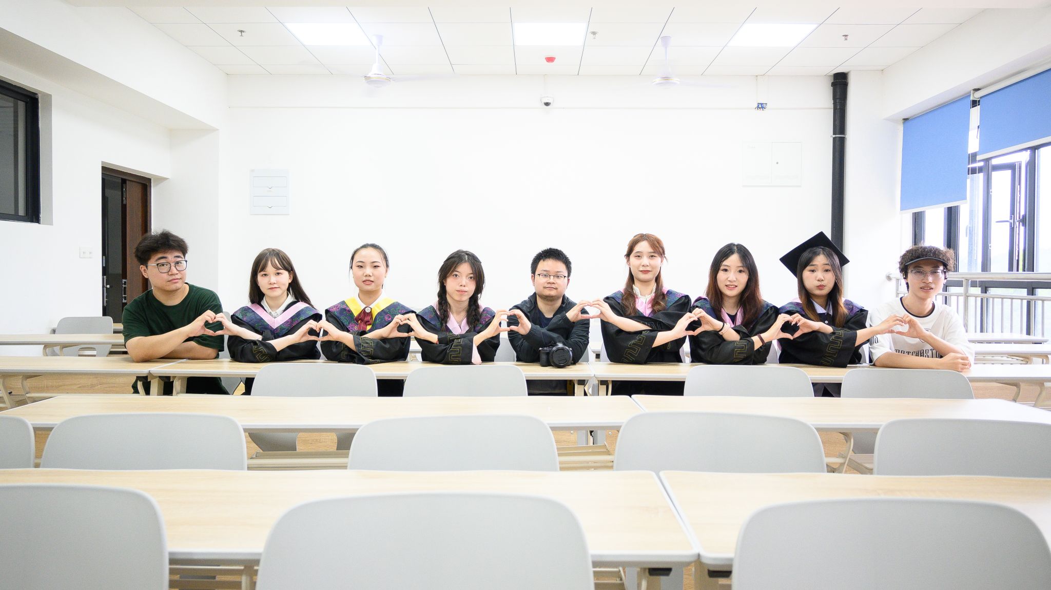 在教室座位上比心 张贝贝摄