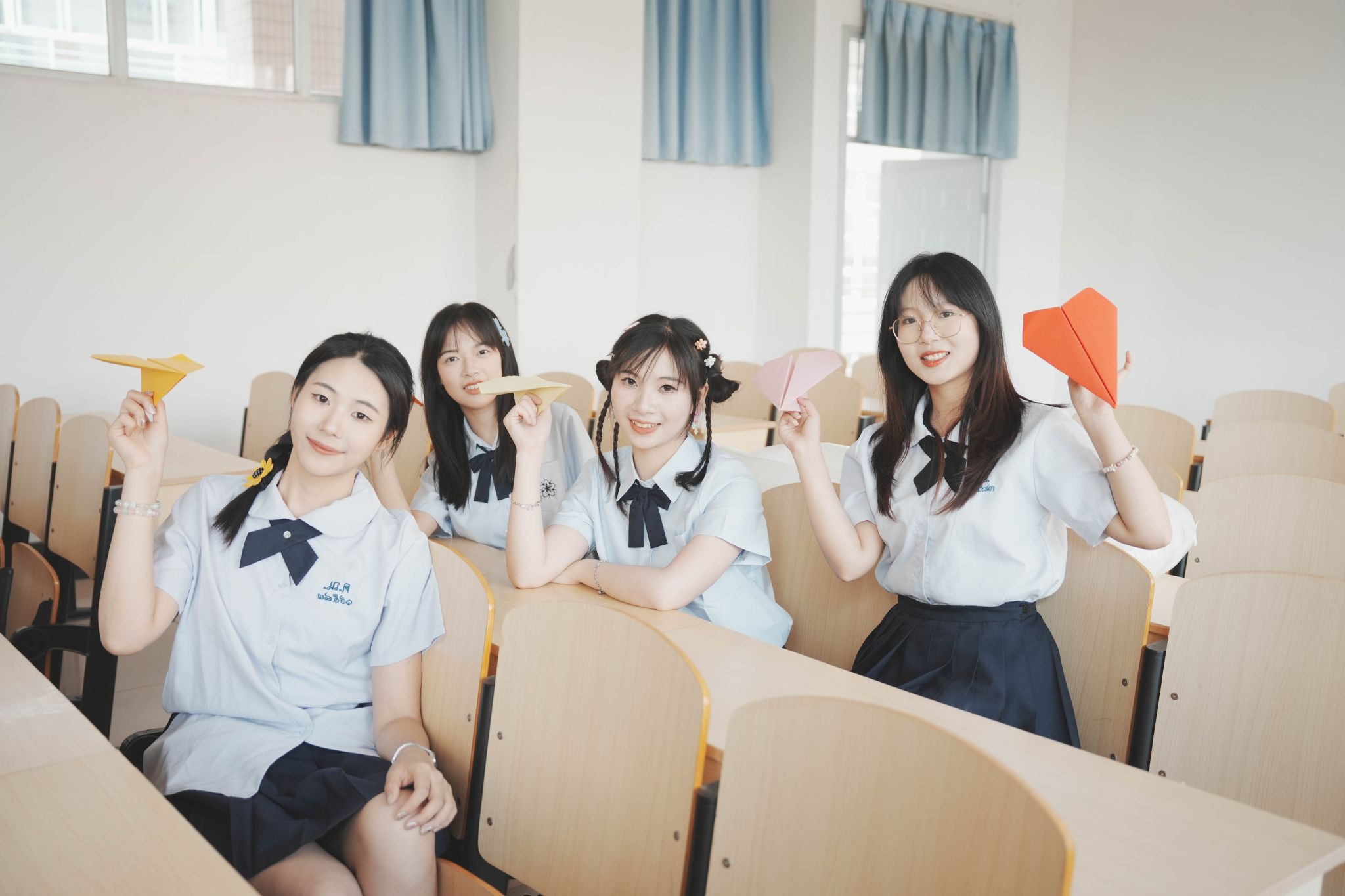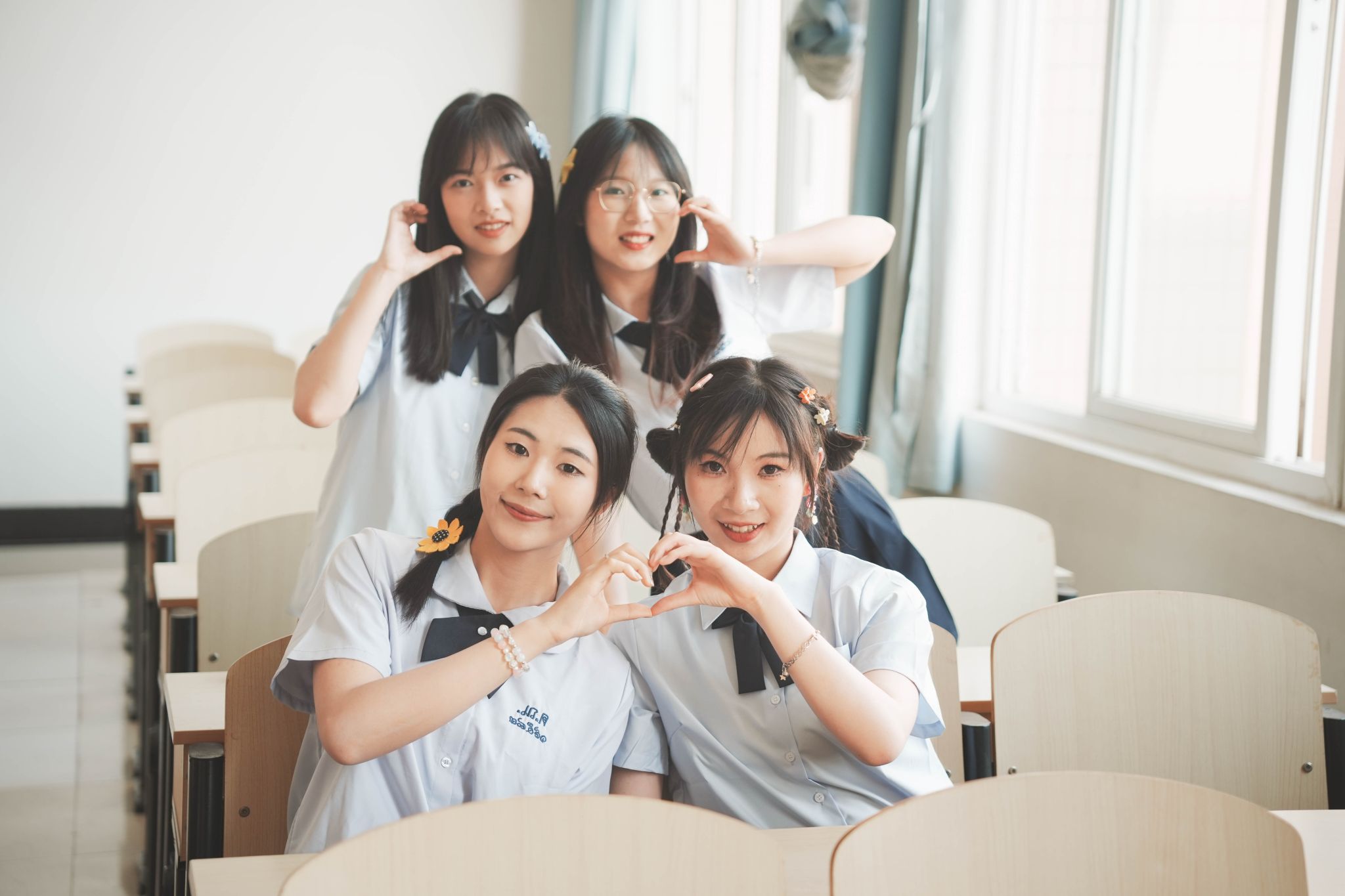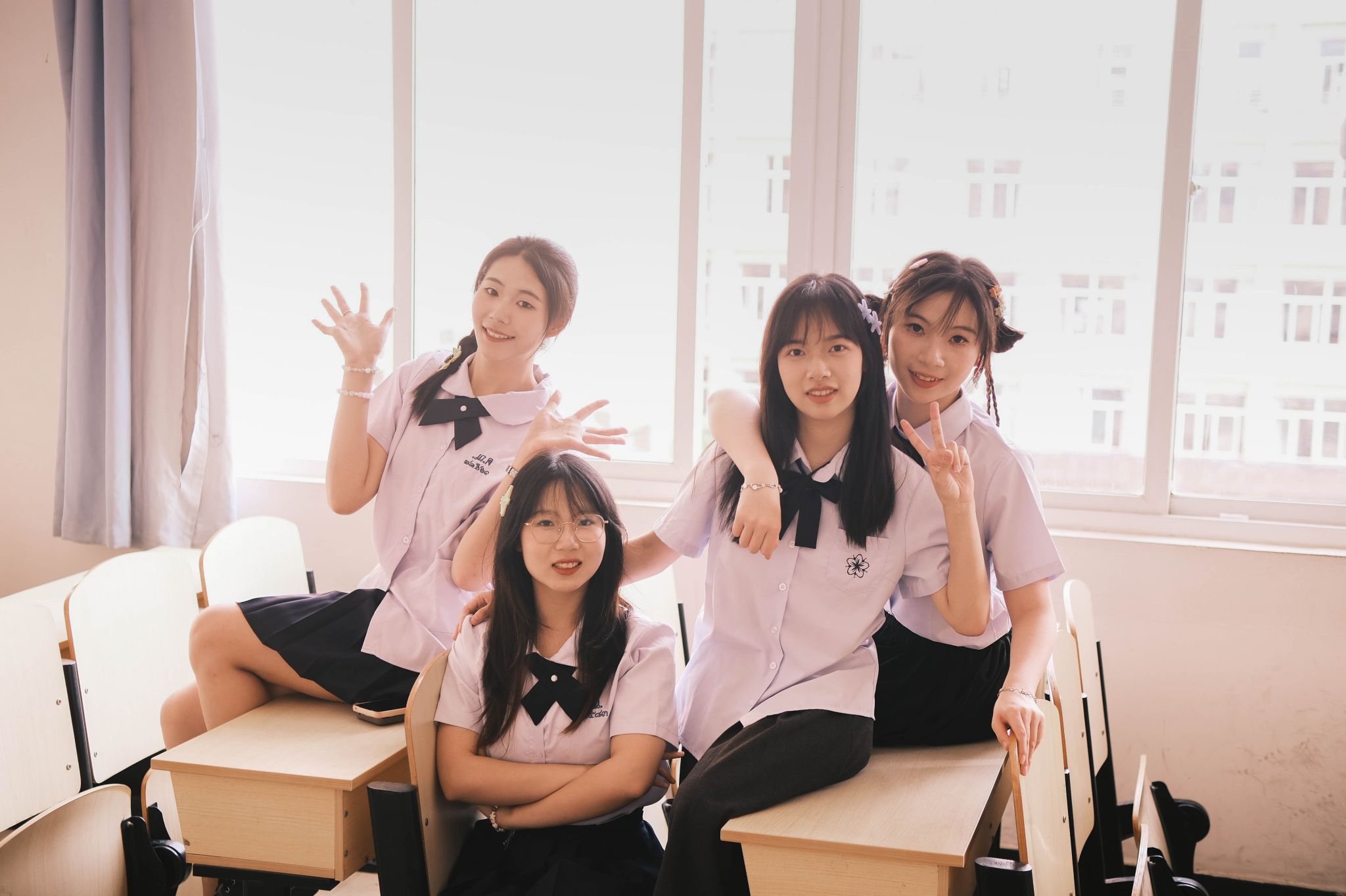 教室坐桌子上合照 陈薏帆摄