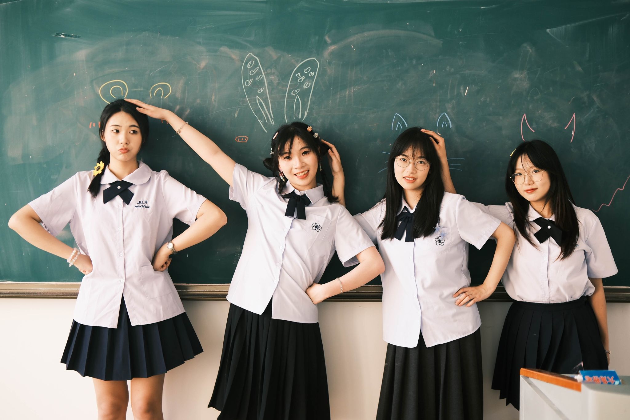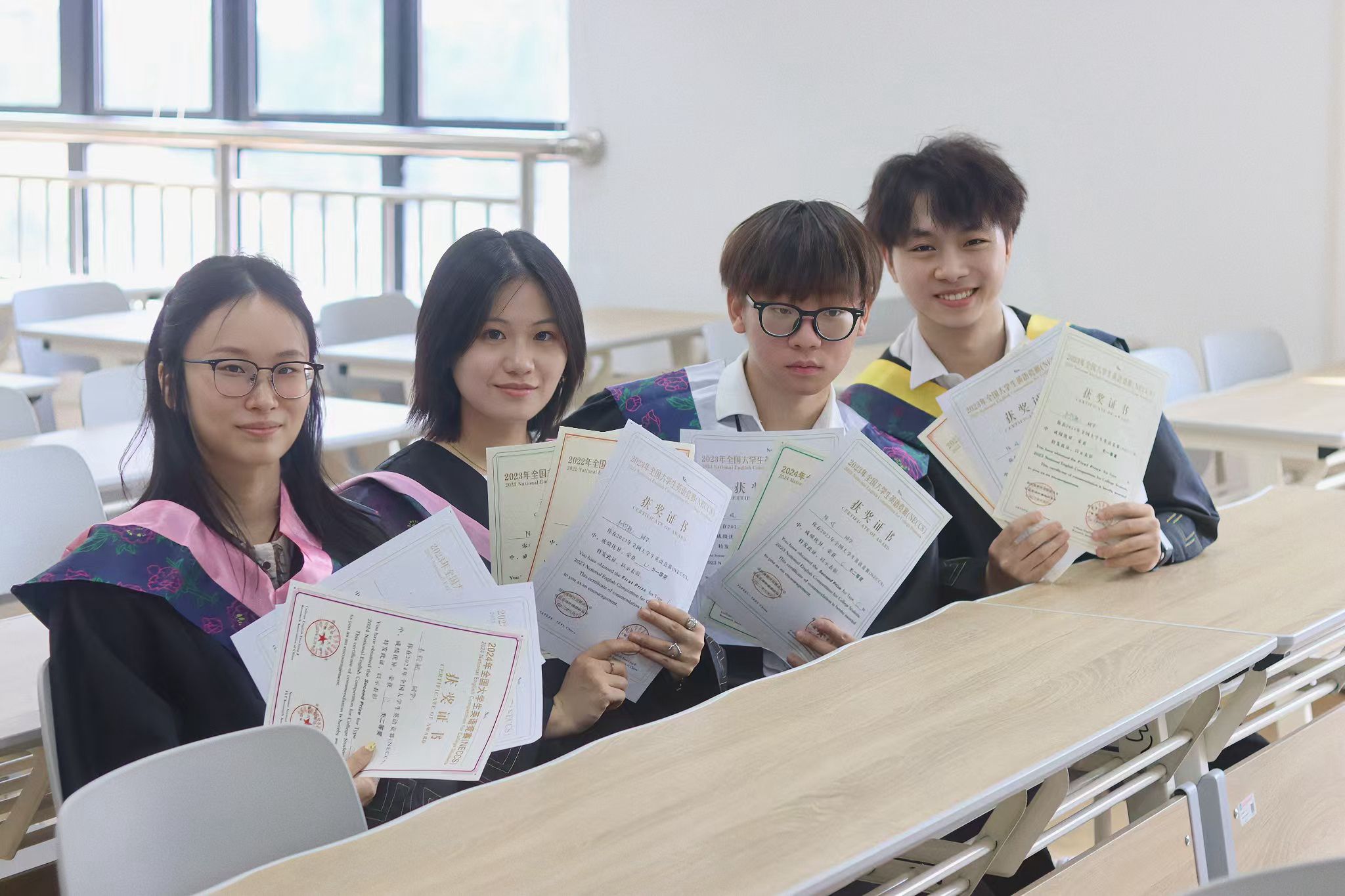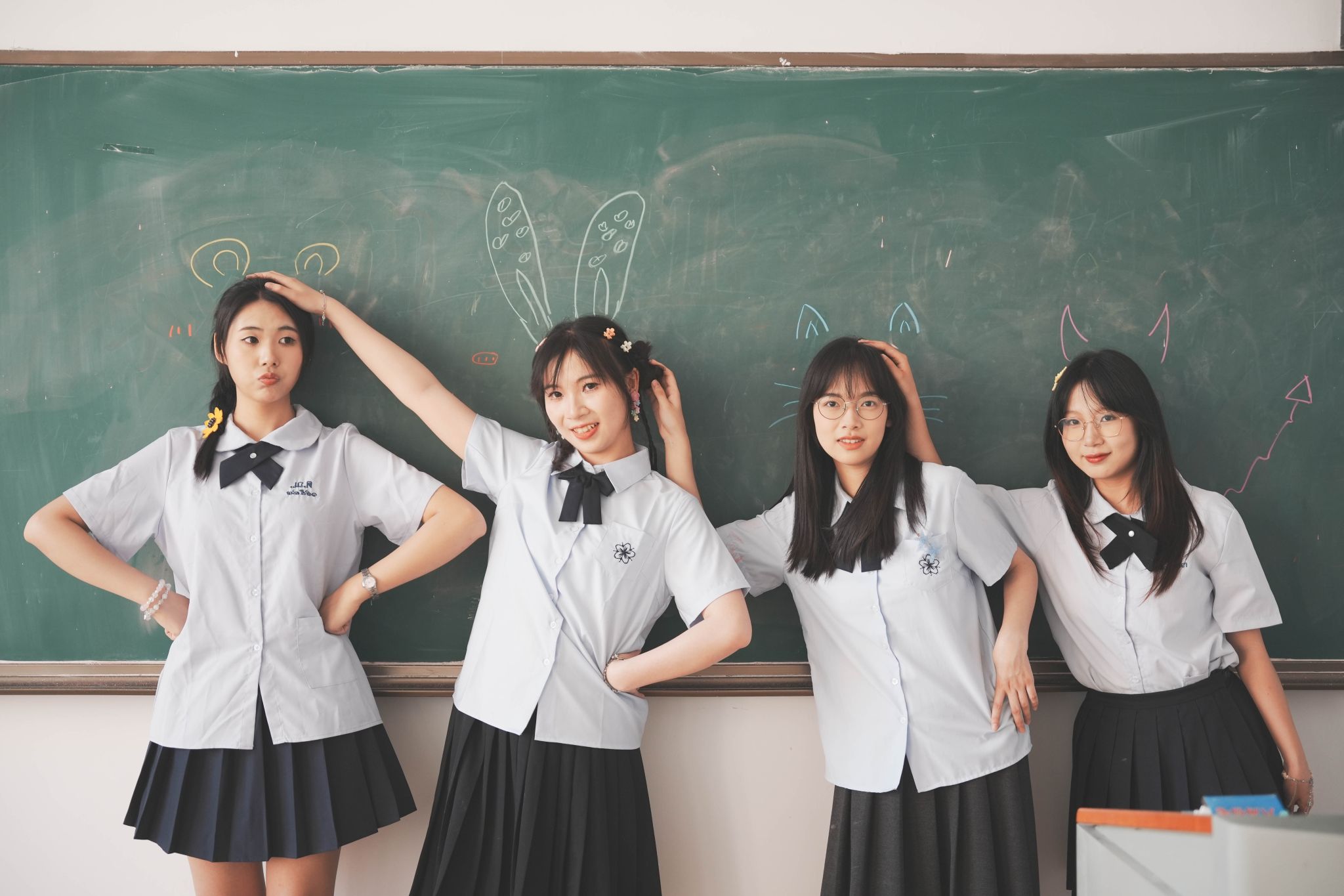 教室坐桌子上合照 陈薏帆摄