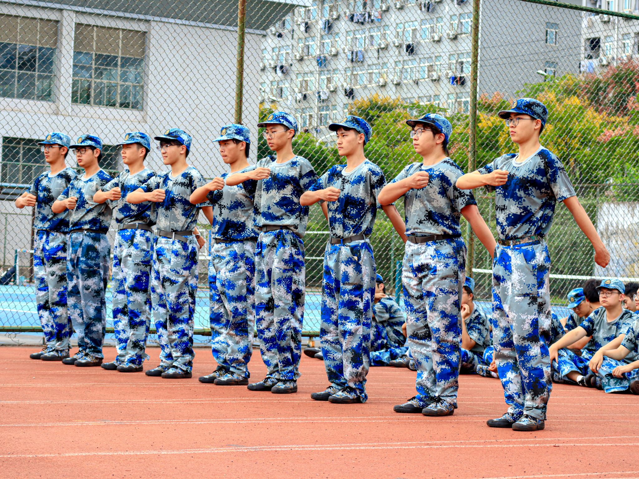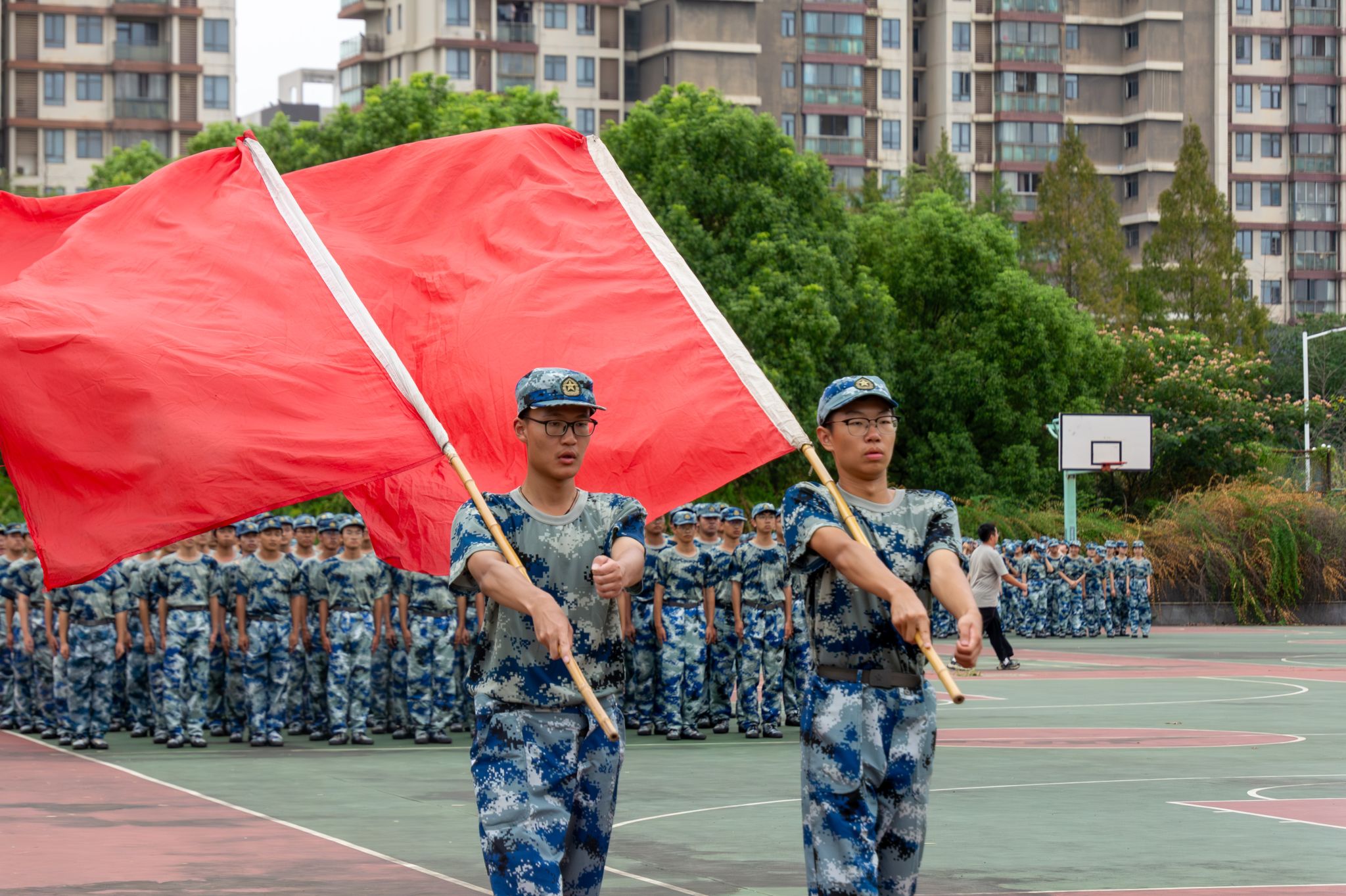 扛旗学生训练近景 王翔宇摄