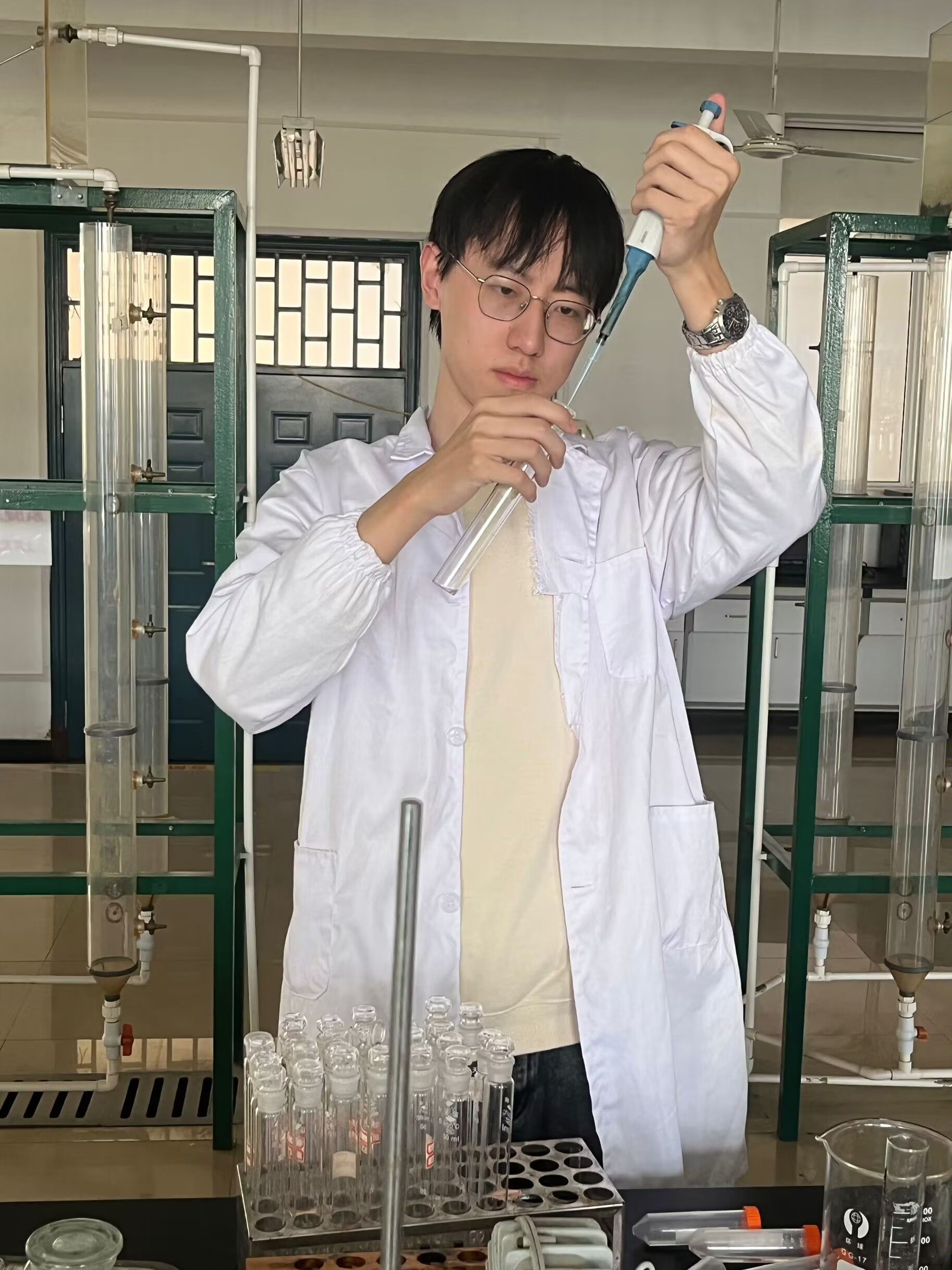 余哲在大二下学期,开始自己设计实验方向并进行论文写作。针对“高浓度废水如何处理”这一问题,余哲在翻阅了大量文献后,他发现豆制品废水是一种有机废水,其有机物含量严重超标,未经适当处理的豆制品废水,会严重污染水体与水生生物,因此需要一种工艺,能降低废水中的SS和COD含量。通过高浓度废水处理的文献阅读,余哲选取了运用混凝-Fenton氧化法预处理高浓度废水作为自己研究方向,和自己的小组在大二学期进行实验操作。在暑假时期,通过所学习的软件分析实验数据,以一作身份,在《湖北大学学报(自然科学版)》发表了一篇论文。