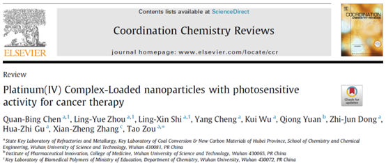 武科大网讯(通讯员吴蔓玲 见习记者韩延通)近日,Coordination Chemistry Reviews(中科院1区,影响因子24.8),录用发表了我校化学与化工学院邹涛教授团队的综述论文“Platinum(IV) Complex-Loaded nanoparticles with photosensitive activity for cancer therapy”。邹涛教授指导的学生陈全兵、周灵悦和石铃昕为第一作者,邹涛教授为通讯作者,我校为论文第一单位。