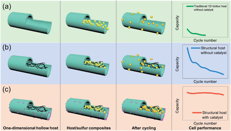 团队成员通过原位构建一种内部空腔体积充分利用的“管中管”碳质主体,负载富含缺陷的金属氮化物纳米颗粒(Fe2N1-x),提供丰富的电子/离子导电通道,最大限度降低多硫化物的穿梭效应,从而提高电池的容量和循环稳定性。研究论文《A spatially efficient “tube-in-tube” hybrid for durable sulfur electrochemistry》,在线发表于能源材料领域权威期刊Journal of Materials Chemistry A上(2021年影响因子12.732,DOI: 10.1039/d1ta10181a)。我校2018级硕士研究生童钊明为本文第一作者,耐火材料与冶金国家重点实验室黄亮副教授和雷文副教授为本文共同通讯作者。