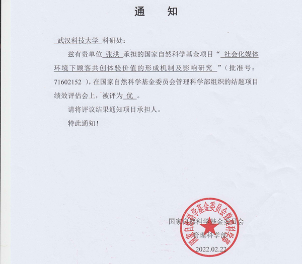 武科大网讯(通讯员吴紫琴 见习记者李祥松)我校恒大管理学院副教授张洪承担的国家自然科学基金项目“社会化媒体环境下顾客共创体验价值的形成机制及影响研究”,在国家自然科学基金委员会管理科学部组织的结题项目绩效评估会上,被评为优。