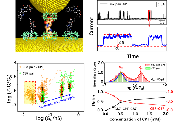 研究团队以葫芦[7]脲超分子为纳米反应器,运用识别隧道电流技术研究了限域空腔中药物分子喜树碱的结构转变,实现了动态可逆过程的精准表征,为众多无锚基分子在不同化学环境下的结构动态监测提供了新方法。论文“Dynamic Interconversions of Single Molecules Probed by Recognition Tunneling at Cucurbit[7]uril-Functionalized Supramolecular Junctions”在线发表于国际顶尖期刊Angewandte Chemie International Edition,并被评为热点文章(https://doi.org/10.1002/anie.202203830)。材料与冶金学院博士生肖博怀为该论文的共同第一作者,常帅教授、德国不来梅雅各布大学Werner M. Nau教授和我校化学与化工学院刘思敏教授为该论文共同通讯作者,我校为成果第一完成单位。