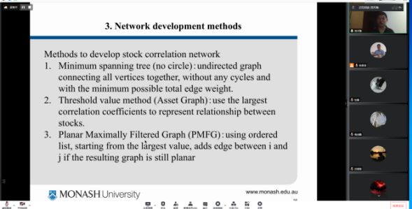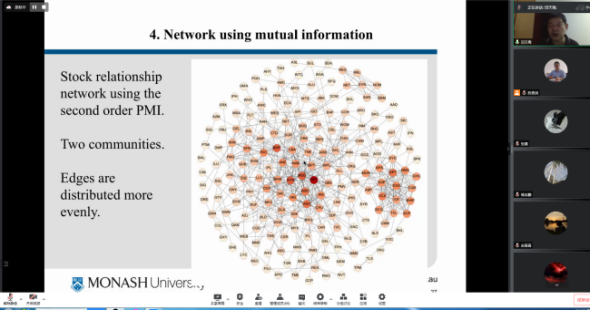 武科大网讯(通讯员张婷婷 周俊爽)6月10日晚七点,澳大利亚莫纳什大学田天海教授应邀,于线上平台向理学院的师生作题为“Stock Networks Using Mutual Information Theory”的学术报告。报告会由我校理学院副院长陈贵词教授主持,六十余名师生参加了此次报告会。