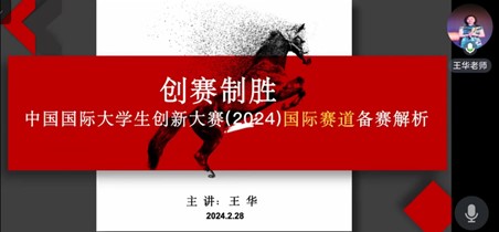 武科大网讯 为进一步激发我校师生参与中国国际大学生创新大赛(2024)的热情,提高学校师生对中国国际大学生创新大赛国际赛道规则的进一步了解,做好备赛工作,2月28日上午,学校邀请中国国际大学生创新大赛辅导专家王华老师以腾讯会议形式为我校师生做了题为“中国国际大学生创新大赛(2024)国际赛道备赛解析”的专题报告,报告会由创新创业学院副院长汪汝武主持,创新创业学院、国际学院、中外合作办学相关学院等近500名师生参会学习。