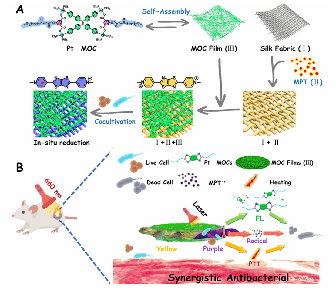 金属-有机环/笼(MOCs)作为一种潜在的可替代抗生素的抗菌候选材料,因其优异的抗菌性能而备受关注。然而,纳米MOCs在可加工性和可迁移性方面的困难限制了其实践应用。王晓强等研究人员开发了具有实时感染指示和高时空精度的新型伤口愈合敷料(图1)。采用多级自组装厘米级Pt MOC膜(III)与阳离子染料(MPT)染色后的真丝织物(I+II)创新性组合(图1A),实现在宏观尺度上合理地应用Pt MOC膜,并有效控制治疗输出。真丝织物上的阳离子染料MPT与细菌共培养后发生明显的颜色变化(从浅黄色变为深紫色),原位还原到其自由基形式,可用于实时监测伤口感染(2 h内即可出现明显变色现象)。此外,MPT自由基在660 nm激光照射下表现出良好的光热效应,可以诱导和控制Pt MOC膜多级组装结构的分解,有效提高了抗菌效率,促进感染创面快速愈合(图1B)。这项工作为厘米级金属-有机环/笼(MOCs)材料的宏观实践应用、细菌实时监测和促进伤口愈合提供了新的思路。