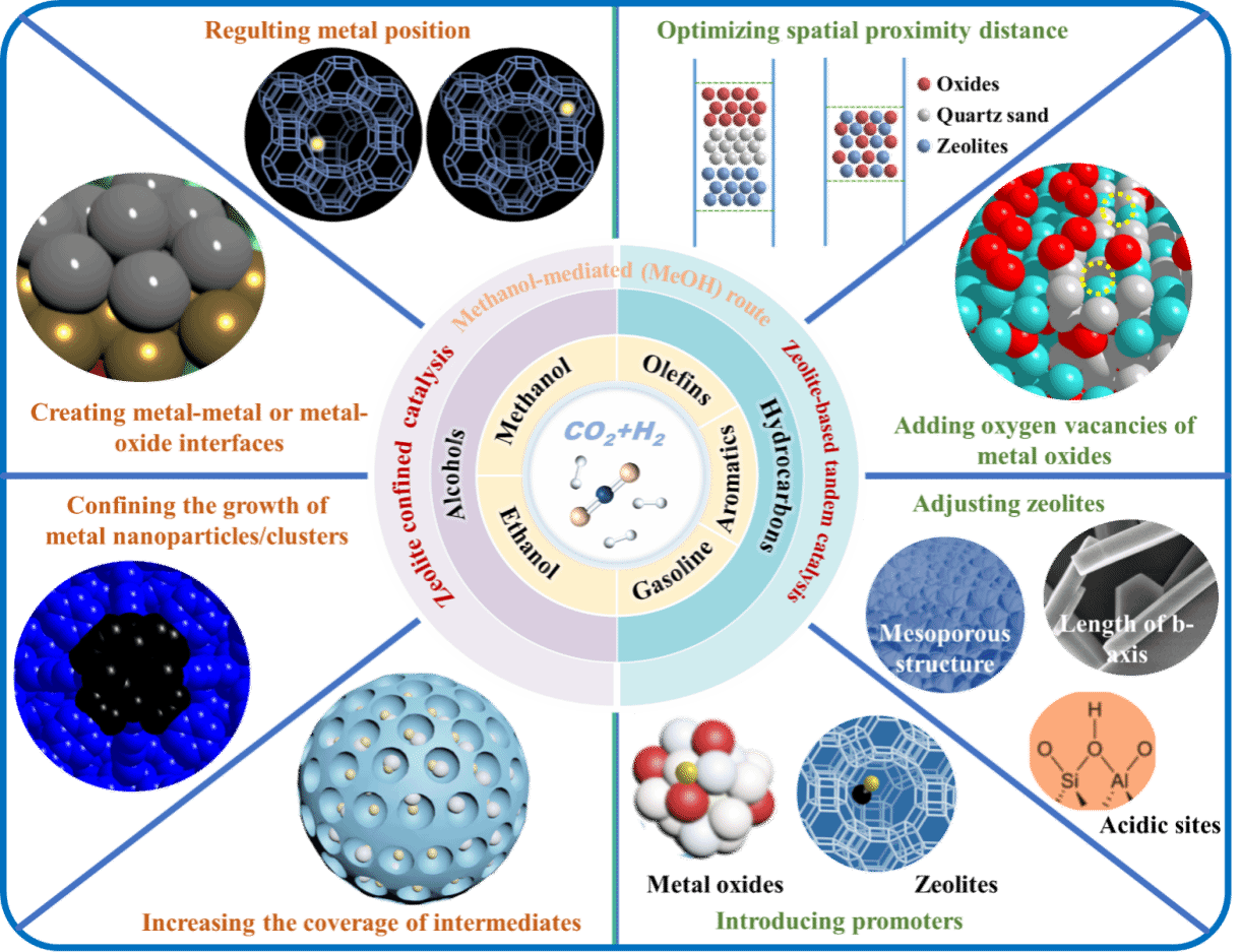 论文从分子筛择形催化的视角出发,全面而深入地阐述了近年来分子筛材料在CO2加氢领域内的最新进展与趋势。目前,通过热催化技术将CO2与绿色H2转化为高附加值的能源小分子和基础化学品,如醇类、烯烃和芳烃,是未来缓解全球气候变暖、实现双碳目标最有前途的战略之一。然而,CO₂加氢反应网络错综复杂,且在分子筛内部精准调控多个活性位点上的C-O键活化和C-C键耦联过程极具挑战性,因此开发兼具高活性与高选择性的催化剂依旧面临重重困难。目前,国内外的科学家们已探索了结合氧化还原型金属位点与分子筛酸性位点的双功能性,但这些探索尚缺乏系统性考量,以至于未能确立清晰的结构-性能关系。为填补这方面的空缺,该论文全面而批判性地概述当前关于分子筛限域金属型催化剂在醇类合成中的应用,以及通过甲醇介导路径在CO₂加氢过程中用于C2+烃类产物合成的分子筛串联催化体系的研究进展。特别地,着重评估了“氧化还原-酸”双功能催化体系内的限域效应与邻近效应对催化性能的影响,尤其是对产品分布的调控作用,并从机理层面进行深入剖析。最后,文章不仅详尽探讨了催化过程中各催化剂组分间的协同作用,还为促进新型或改良型催化剂系统的理性设计提供了极具价值的洞见与启示。鉴于分子筛在二氧化碳加氢转化过程中所面临的挑战与潜在机遇,该综述为推动构建可持续、高效的CO2资源化利用贡献力量,助力实现环境友好型化学工艺的发展。