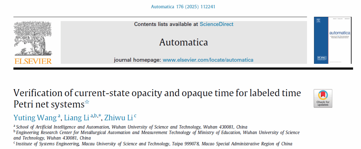 武科大网讯 近日,我校人工智能与自动化学院硕士研究生在国际控制领域顶级期刊《Automatica》上以长文(Regular Paper)形式发表题为“Verification of Current-State Opacity and Opaque Time for Labeled Time Petri Net Systems”的研究论文。该论文第一作者为我校2022级硕士研究生王宇婷,其导师黎良担任通讯作者,国产亚洲精品久久久久久久_无码AV免费精品一区二区三区_99久久久无码国产精品免费人妻_精品人妻无码一区二区三区在线_无码专区久久综合久综合字幕_久久精品国产一区二区三区四区_真实一级一级一片免费视频_特级精品毛片免费观看_国产成人无码AA片免费看为论文的第一完成单位。
