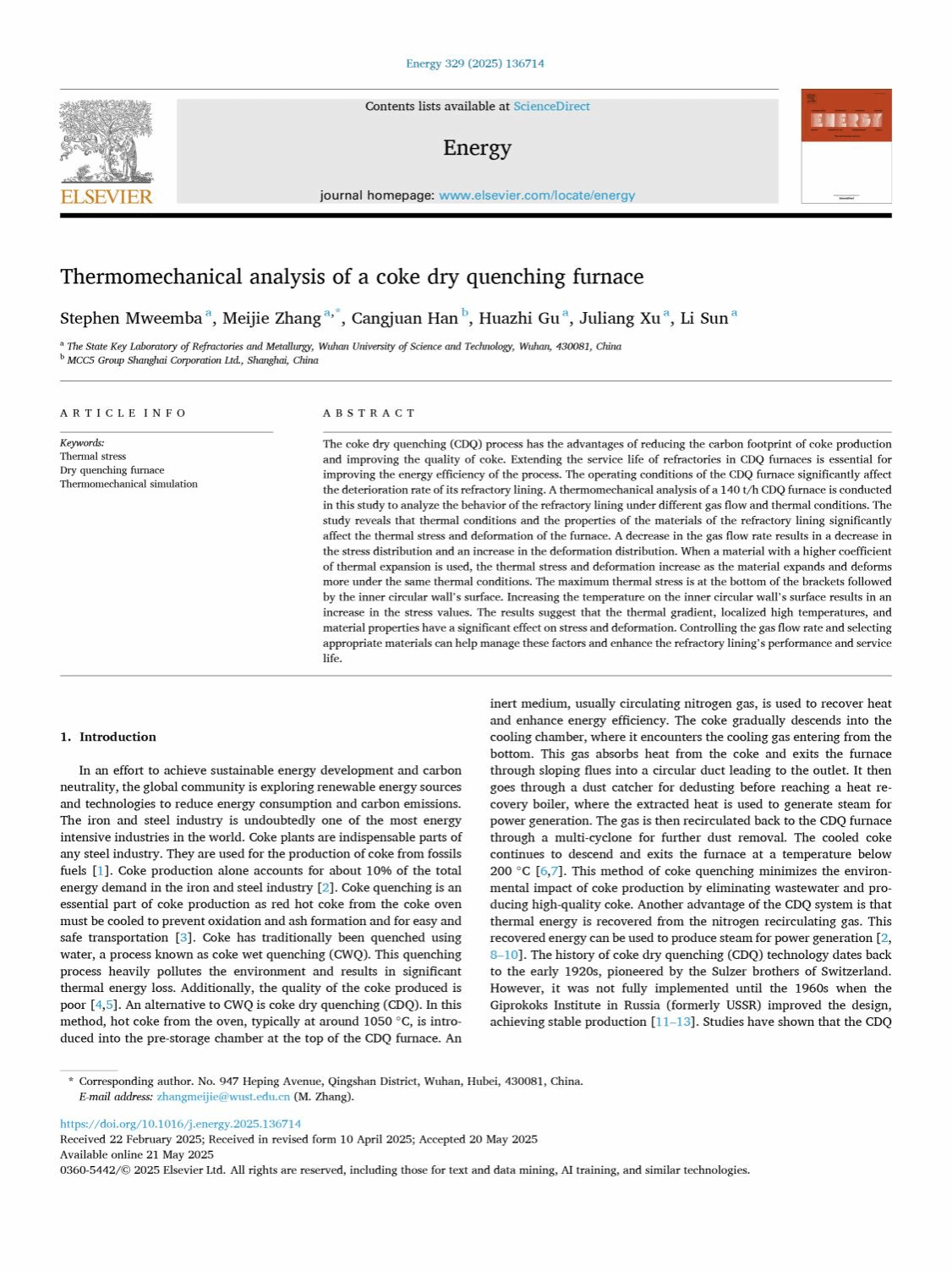 武科大网讯 近日,我校材料学部顾华志、张美杰教授团队指导的留学生Stephen Mweemba,以第一作者身份在国际权威期刊《Energy》(影响因子:9;中科院工程技术大类一区)发表题为《Thermomechanical analysis of a coke dry quenching furnace》的高水平论文。