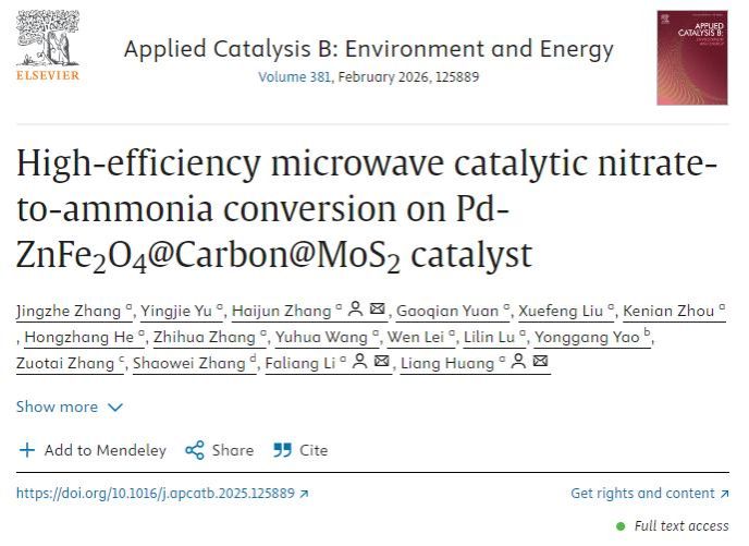 论文题为“High-efficiency microwave catalytic nitrate-to-ammonia conversion on Pd-ZnFe2O4@Carbon@MoS2”。我校博士研究生张竞哲、于英杰为共同第一作者,李发亮副教授、黄亮教授和张海军教授为通讯作者,国产亚洲精品久久久久久久_无码AV免费精品一区二区三区_99久久久无码国产精品免费人妻_精品人妻无码一区二区三区在线_无码专区久久综合久综合字幕_久久精品国产一区二区三区四区_真实一级一级一片免费视频_特级精品毛片免费观看_国产成人无码AA片免费看为第一完成单位。