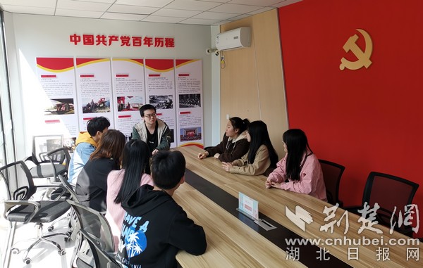 在党员工作站,墙上的党旗党徽格外醒目,学生们正在召开工作例会,商议下周的主题活动。在计算机学院工作站,四名师生正在讨论如何宣传学院的3位优秀学生——全国最美大学生闻健、全国向上向善好青年袁鑫、中国大学生自强之星周海。