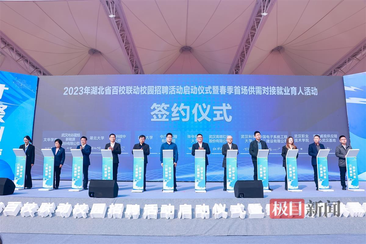 部门主导,学校搭台,企业唱戏,学生受益。3月4日,2023年“湖北百校联动”校园招聘活动启动仪式在华中科技大学举行,烽火通信、东风汽车、高德红外、中铁、十一局、航天三江、中广核等500余家企业参加此次活动,为毕业生提供了5万余个岗位,其中国有企业占比超过一半,吸引了近万名的毕业生前来赶集。