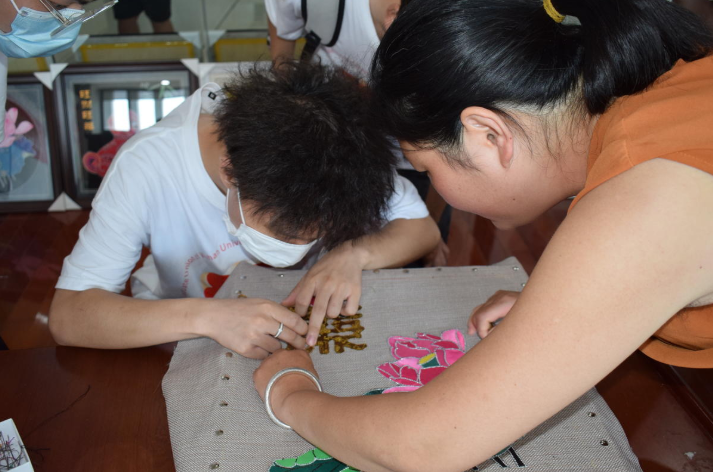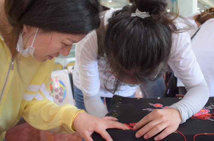 在参观学习以后,胡芳与团队的队员们一同来到布贴传习所亲自动手尝试缝制阳新布贴。“布贴要经过裁剪底布、剪花样纸、剪粘色布、组合定位等七个步骤,绕边缝饰的时候,针线要对着图案边缘绕线缝制。”团队成员聂丞彬拿起针线,在胡芳的指导下,固定好图案边缘的丝线,绕着线来回缝合。