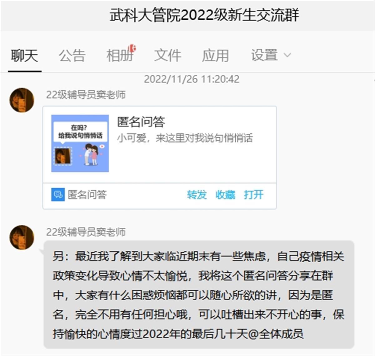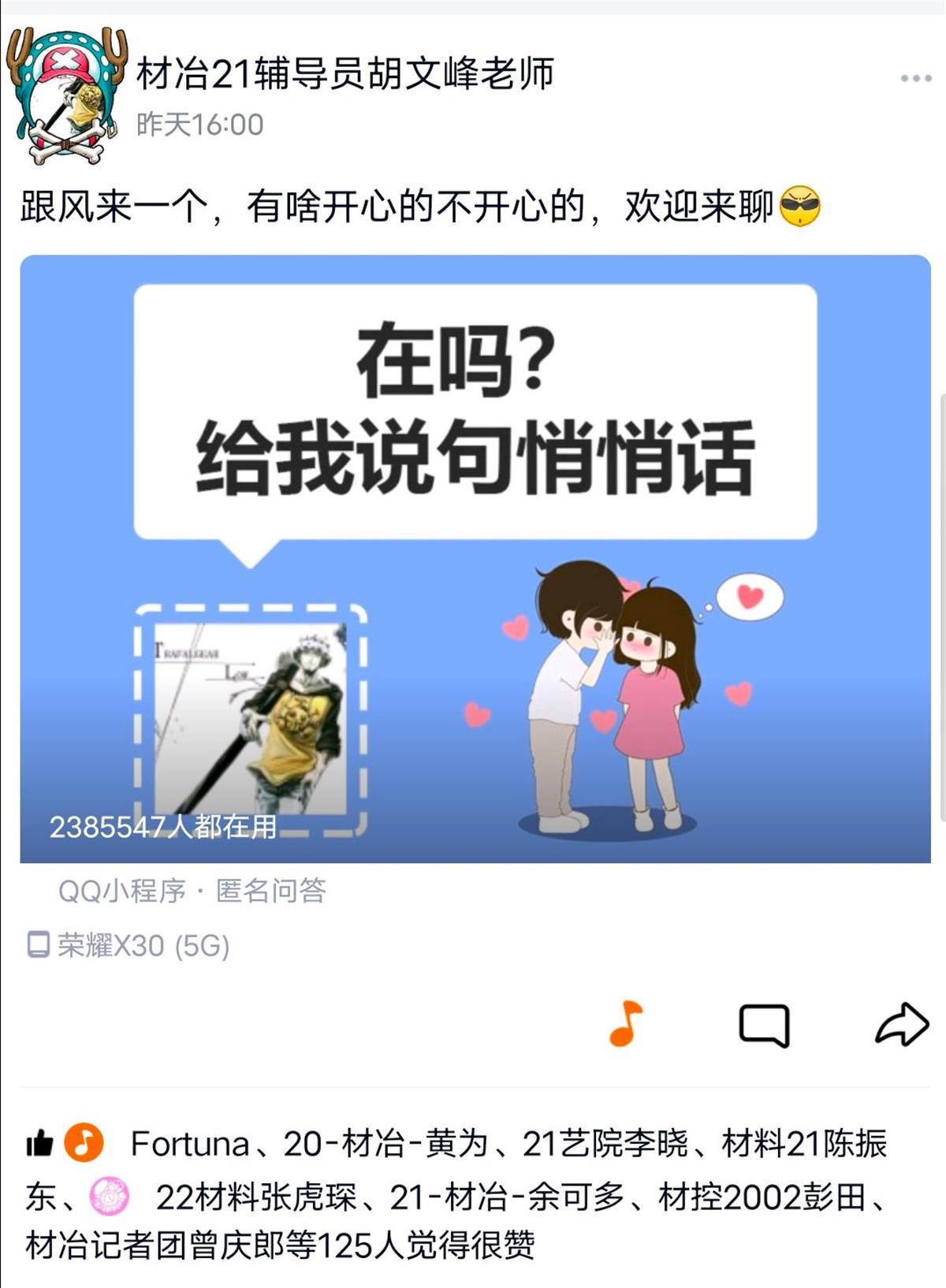 “跟风来一个,有啥开心的不开心的,欢迎来聊……”语言俏皮的文案附上一个匿名问答的QQ小程序,该校材料与冶金学院辅导员胡文峰也在11月29日分享在他的QQ空间上;法学与经济学院辅导员则是约学生们在操场聊天;汽车与交通学院辅导员雷霆霆也在抖音开了与学生聊天的直播间。