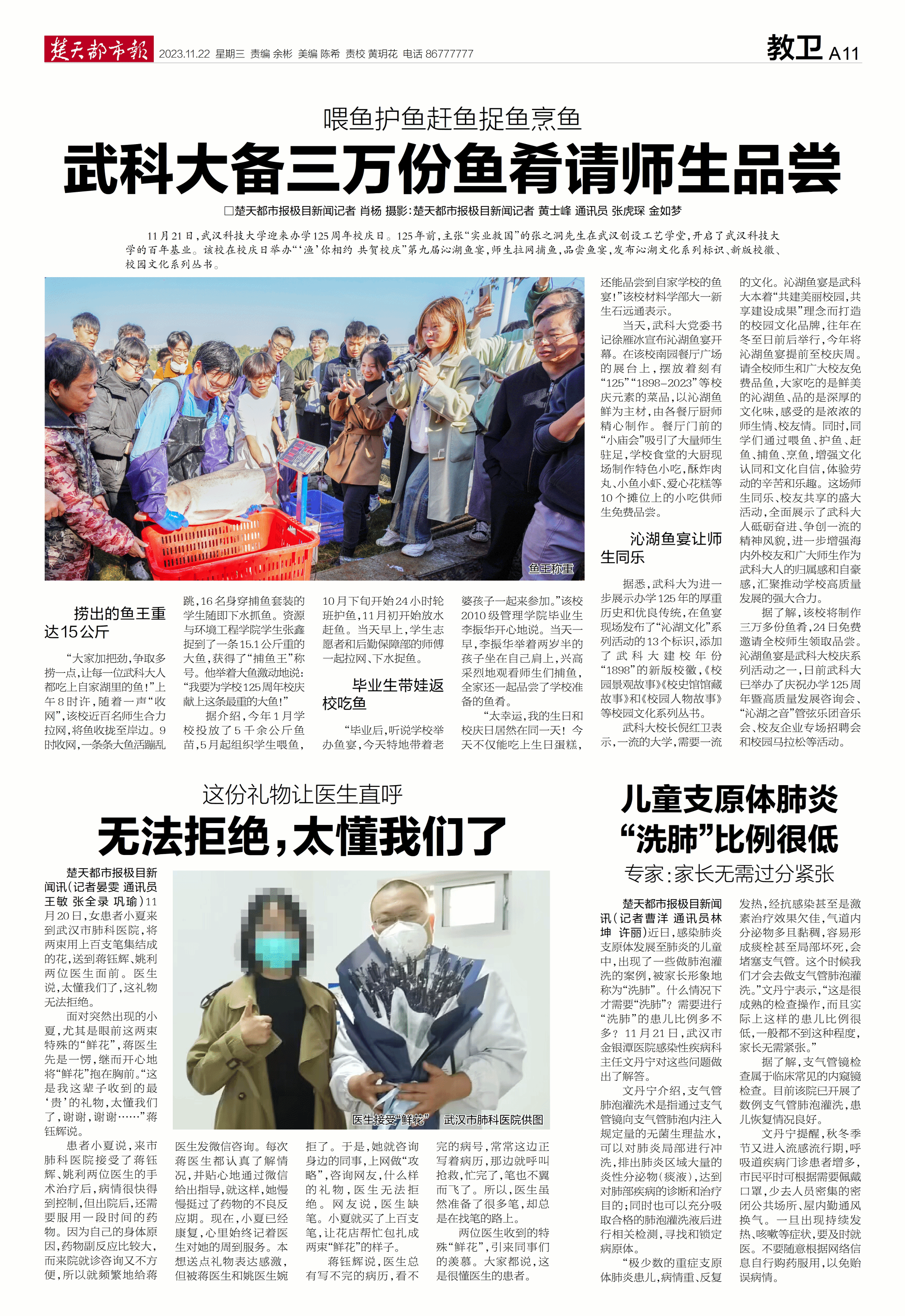 “大家加把劲,争取多捞一点,让每一位武科大人都吃上自家湖里的鱼!”上午8时许,随着一声“收网”,该校近百名师生开始在沁湖边拉纤,合力拉渔网,将其收拢至岸边。九时收网,一条条大鱼活蹦乱跳,16名身穿捕鱼套装的学生随即下水捕鱼。经过半小时的比拼,资源与环境工程学院学生张鑫捕了一条30.2斤重的大鱼,获得了今年的“捕鱼王”称号。他举着大鱼激动地说:“今年我要为学校125周年校庆献上这条最重的大鱼!”