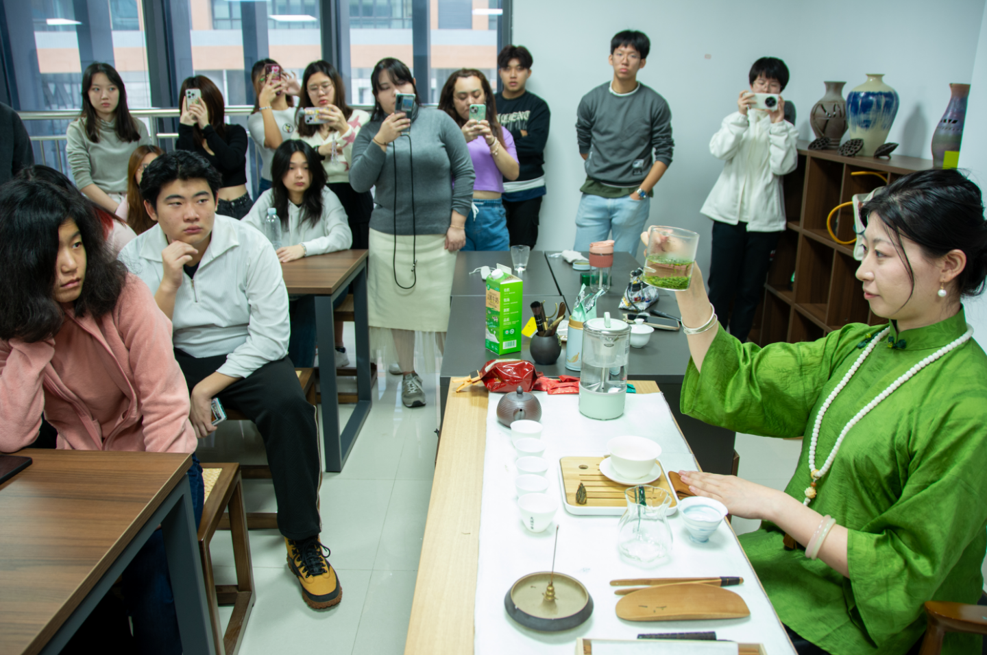 在该校潇湘雨协会成员余子慰吹响的竹萧声中,国际学院教师冯婕为在场师生讲解中国茶艺,邀请她的学生韩宁展示了投茶、注水、出汤、分茶等步骤。Shasthi观察了红茶与绿茶后说:“这是我第一次看到茶叶的实物展示,灯光从杯底照射在水中后看茶,我感到非常新奇!我回国后会自己尝试着泡茶,分享给家人。”